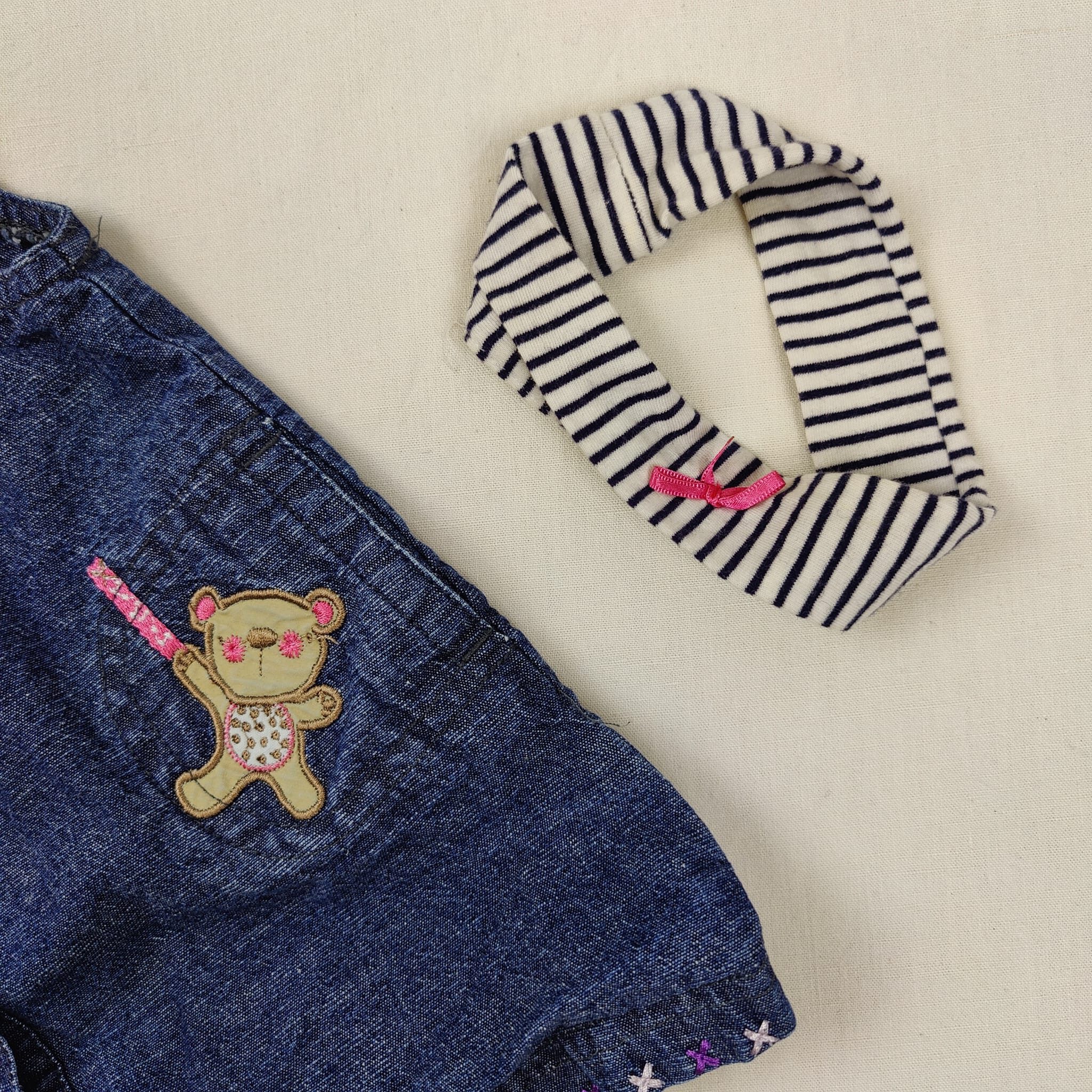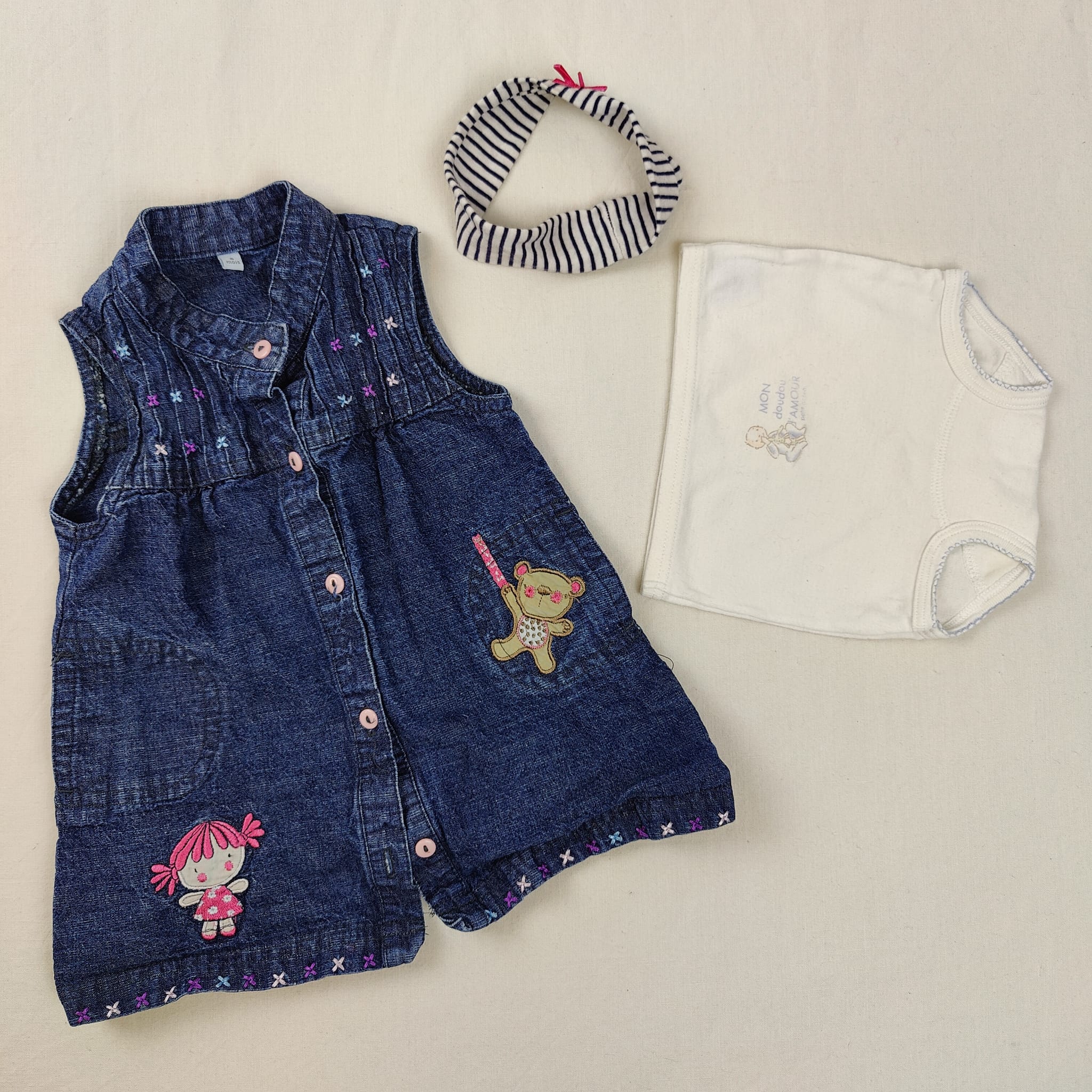 Autres commentaires : Ensemble robe en jean boutoné avec motifs brodés, culotte blanche petit bateau, chouchou rayé bleu marine et blanc avec noeud rose, offert gilet blanc avec boutons dorés