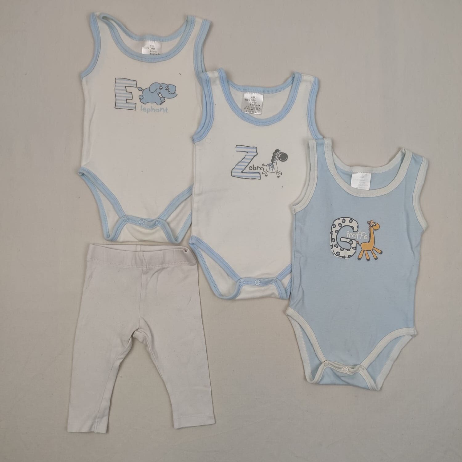 Autres commentaires : Ensemble 4 pièces : – lot de 3 bodies assortis sans manches dont un blanc à liseré bleu clair, motif éléphant et inscription « Elephant » , un blanc à liseré bleu, motif zèbre et inscription « Zebra et un bleu clair à lieré blanc, motif girafe et inscription « Giraffe ». – Legging blanc sans marque (fines peluches d’usage) OFFERT.