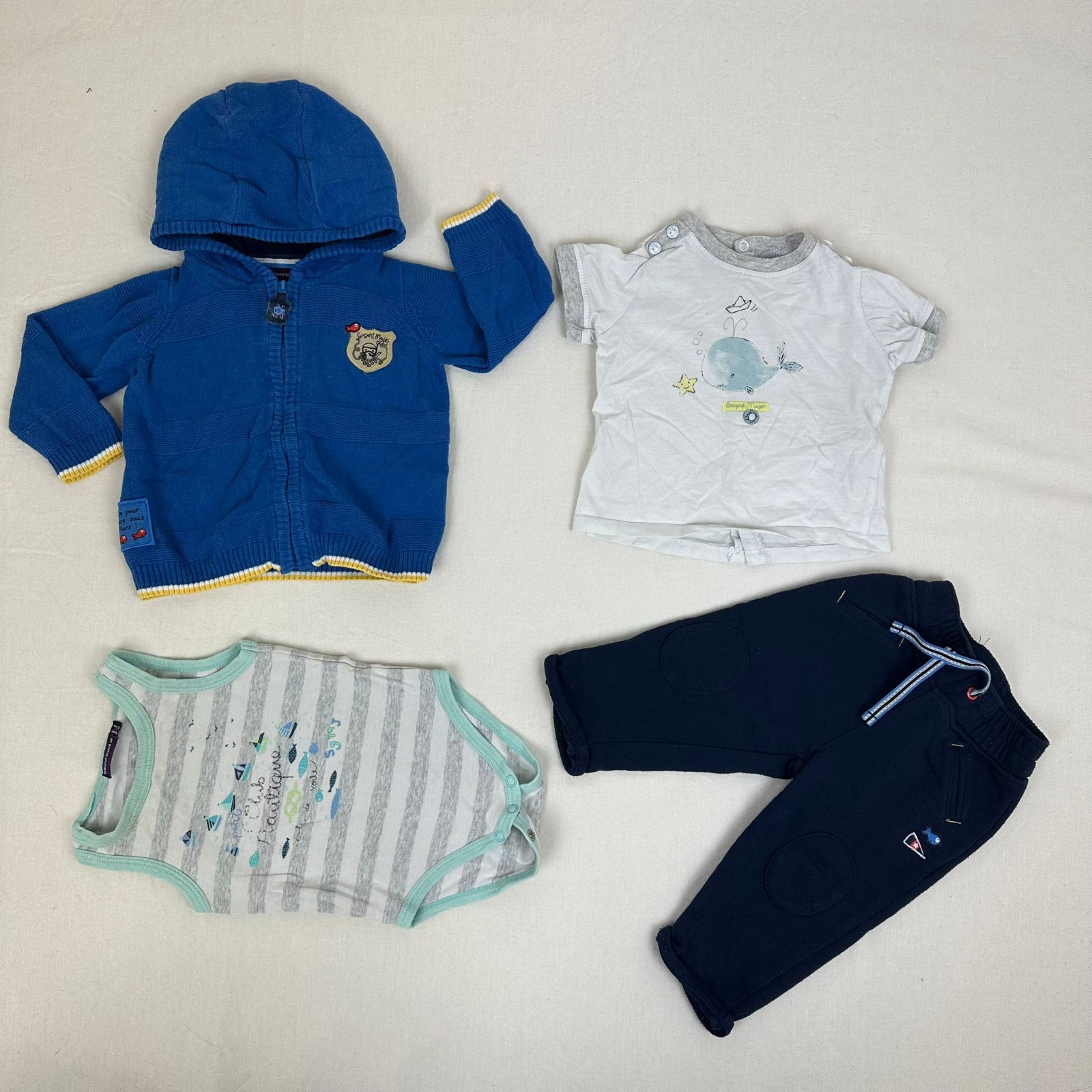 Autres commentaires : T-shirt manches courtes blanc avec une fermeture par boutons au niveau des épaules et au dos.Pantalon jogging bleu foncé avec taille élastiquée et quelques bouloches d’usage.Body gris avec rayures blanches sans manches.Gilet bleu manches longues avec capuche et une fermeture en zip.