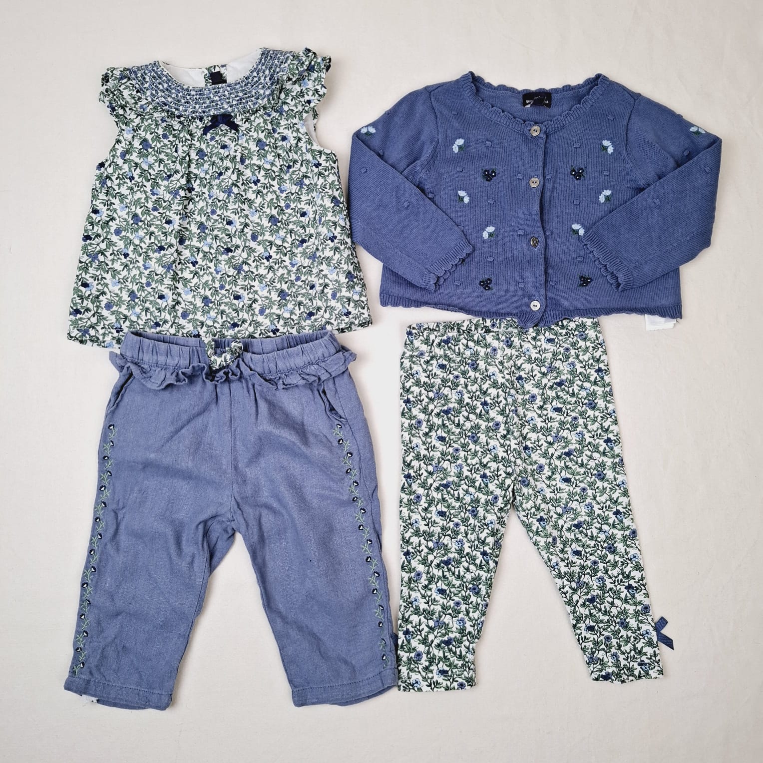 Autres commentaires : Ensemble 4 pièces: – Blouse en popeline avec doublure en voile de coton à manches courtes volantées, motif flfleuri dans les tons vert tendre, bleu ciel et bleu nuit col fantaisie smoké, fermeture par boutons au dos, petit noeud décoratif sur le buste, 100% coton. -Legging assorti, taille élastique. -Pantalon lavande, taille élastique avec volant, motif floral broderie sur les côtés, 82% viscose, 18% lin. -Gilet lavand uni, motif floral broderie, col rond, finition festonnée bord-côte autour de le col, à la base et en bas de manche, 100% coton.