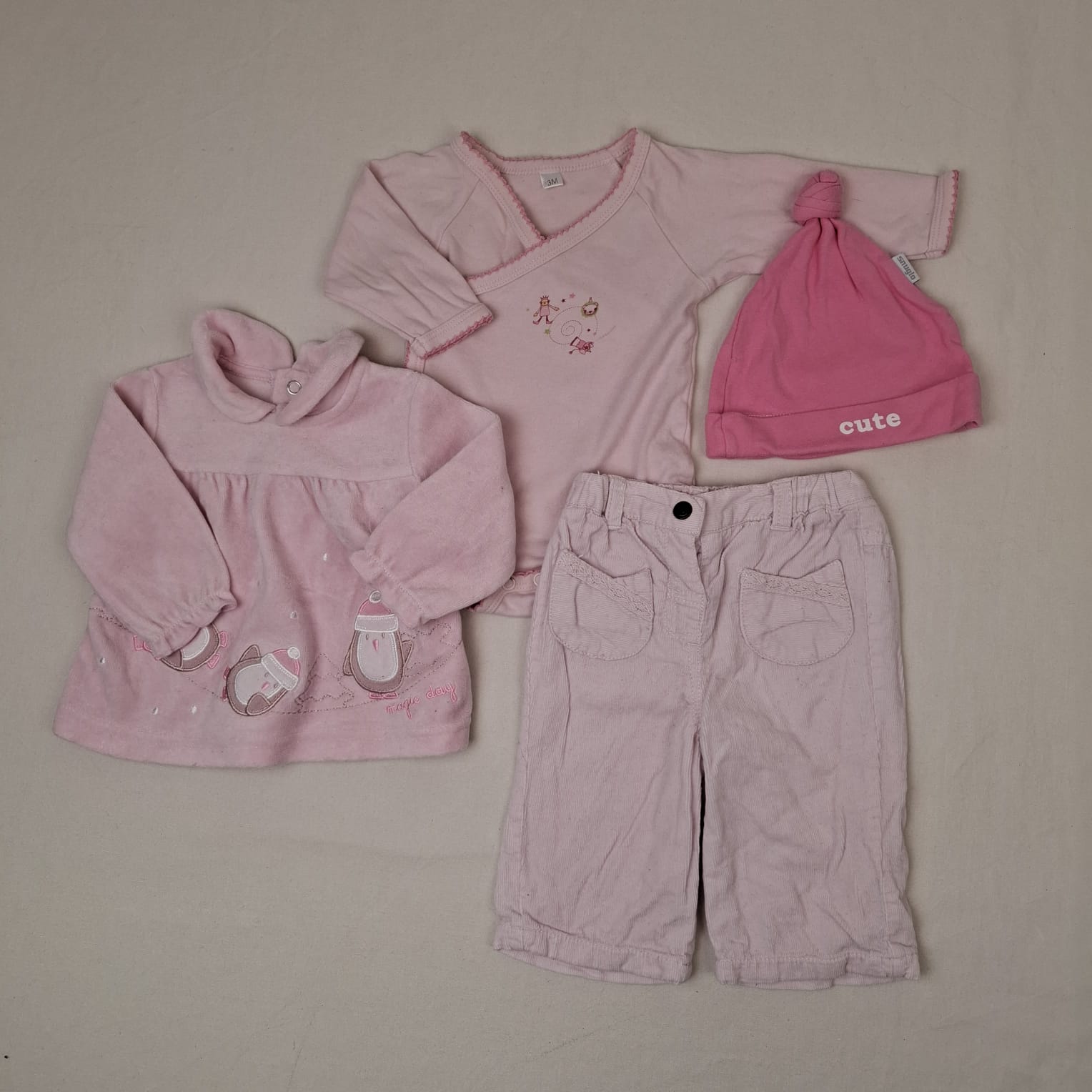 Autres commentaires : Ensemble 4 pièces : – Une blouse en velours rose layette à manches longues, sans marque, devant motif pingouins rose dans la neige avec inscription « magic day », col claudine, froncé devant, poignets élastiquée, fermeture en haut du dos par boutons pression, 75% coton et 25% polyester. – Un bdy croisé manches longues rose pâle, bordures dentelées rose bonbon, petit motif devant d’animaux et pantin dans une spirale avec des étoiles, 100% coton. – Un pantalon en velours côtelé rose pâle Tex Baby, doublure en coton rose pâle, taille élastiquée, fermeture devant par un bouton pression, 100% coton. – un bonnet Snuglo rose foncé en 100% coton, revers avec l’inscription « cute » en blanc noué en haut. Taille 0-6M.