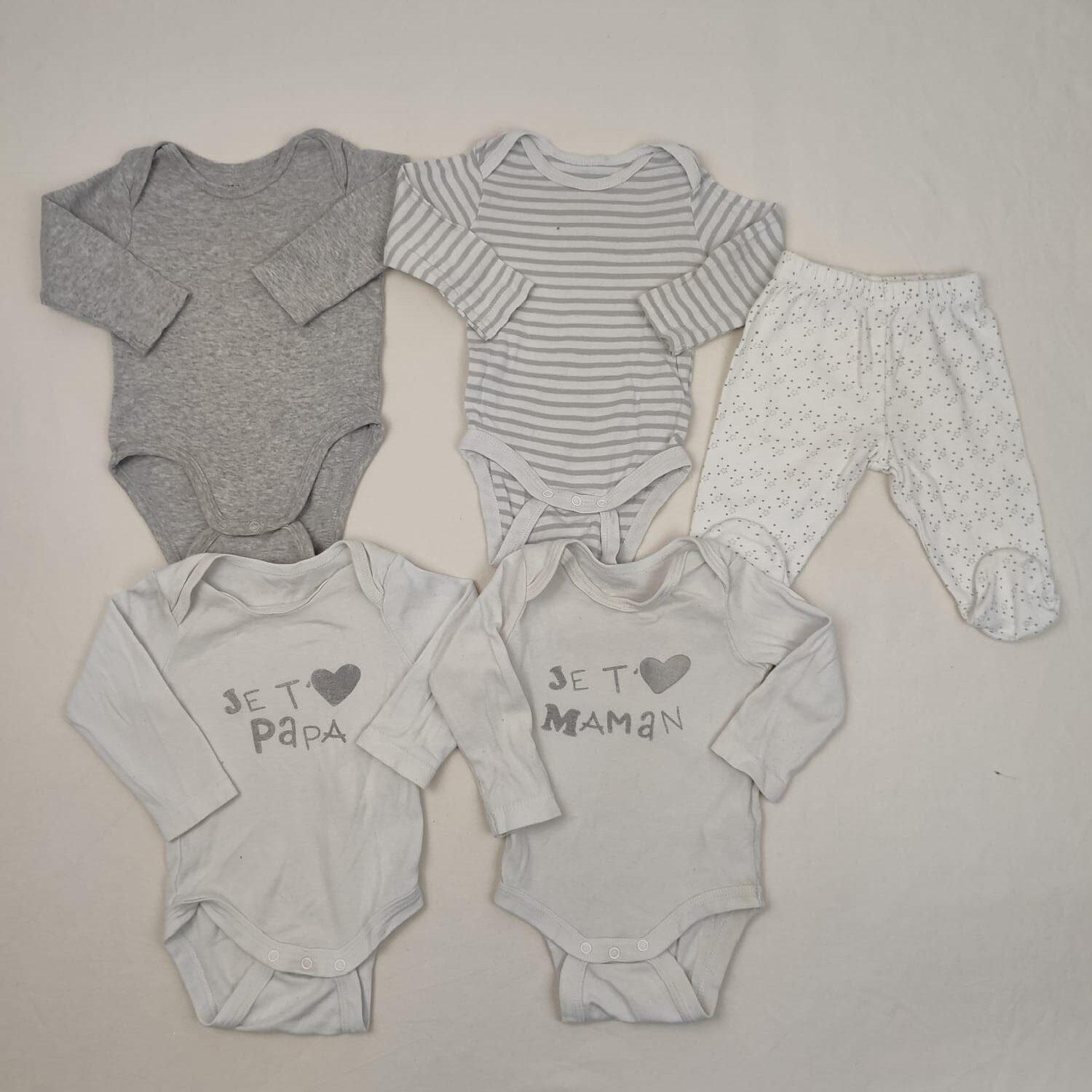 Autres commentaires : Ensemble 5 pièces : – Body manches longues blanc cassé GEMO, inscription » Je t’❤ maman ». – Body manches longues blanc cassé GEMO, inscription » Je t’❤ papa ». – Body manches longues gris uni H&M. – Body manches longues blanc à rayures grises GEMO. -Pantalon blanc avec pieds, motif mini étoiles grises MES PETITS CAILLOUX.