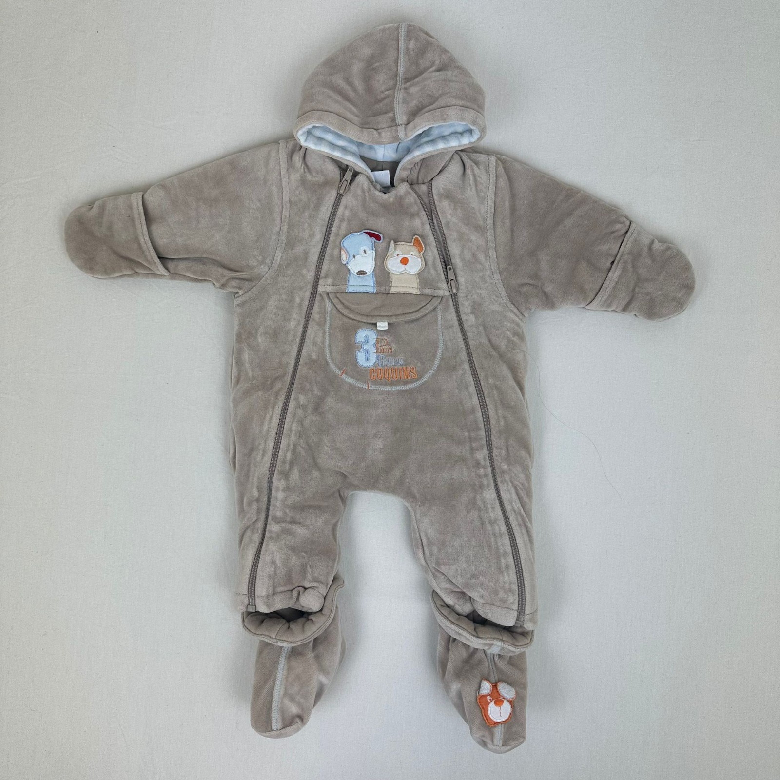 Autres commentaires : 23% polyester. Combi-pilote beige fourrée avec doublure 100% polyester, capuche, avec mains camouflés et avec pieds et une double fermeture en zip.