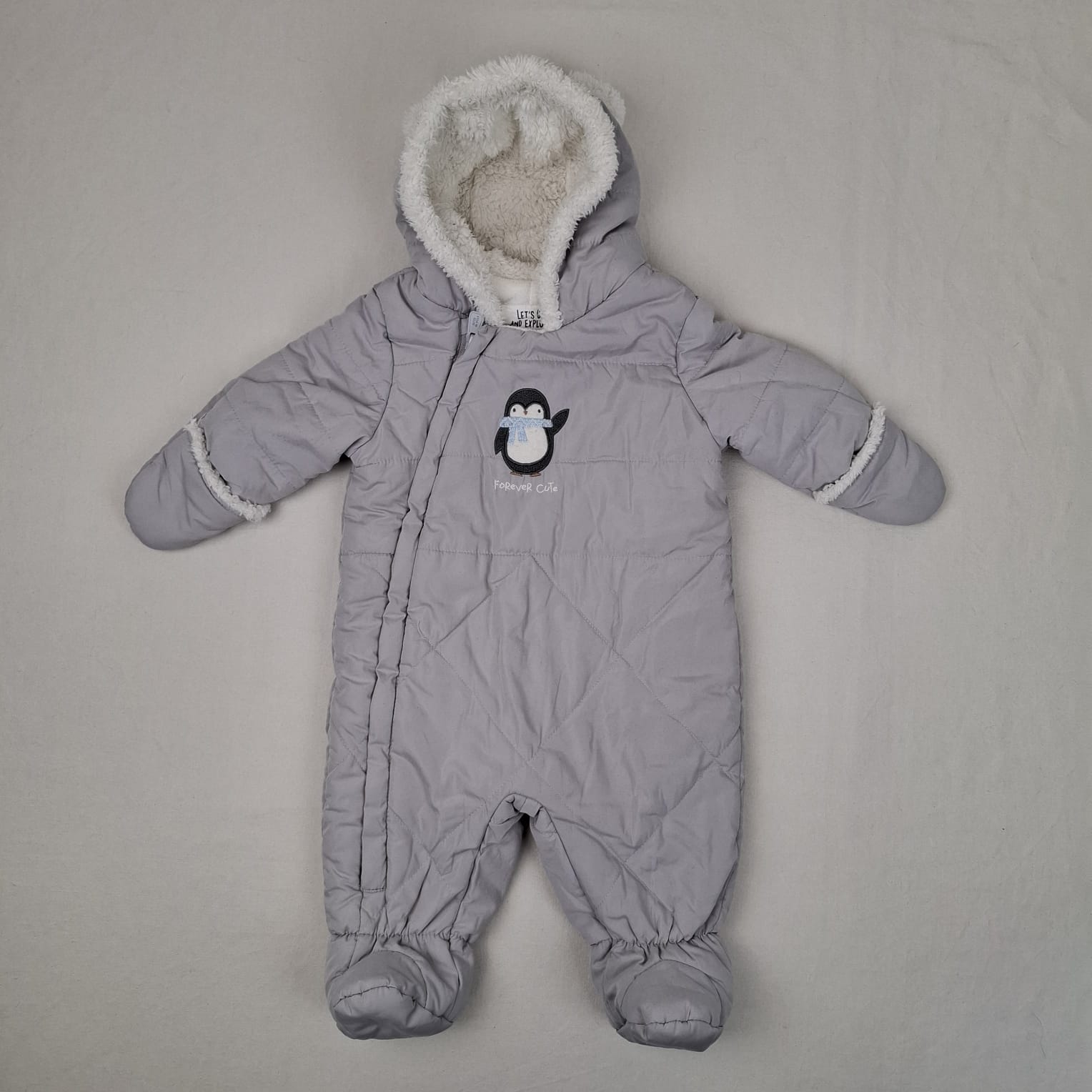 Autres commentaires : Combipilote Baby club 6M avec capuche pieds et mains intégrés ,interieur fourure , bleu ciel avec motifs pingouin à l’avant, fermeture éclaire avant