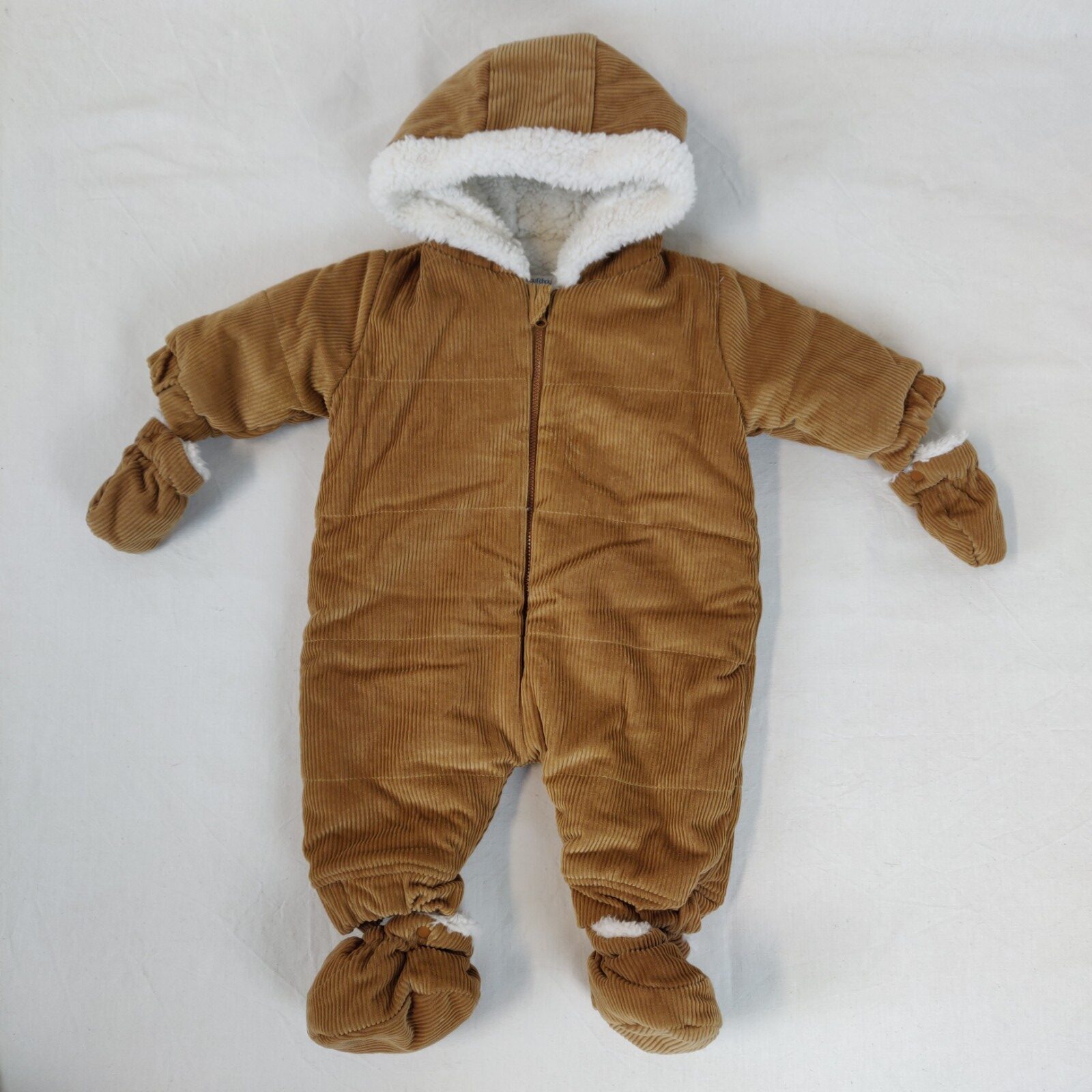 Autres commentaires : Combi-pilote doublée en fourrure synthétique à capuche et à pieds amovibles en velours côtelé marron. Ouverture centrale zippée. Moufles amovibles assorties s’attachant avec des pressions.