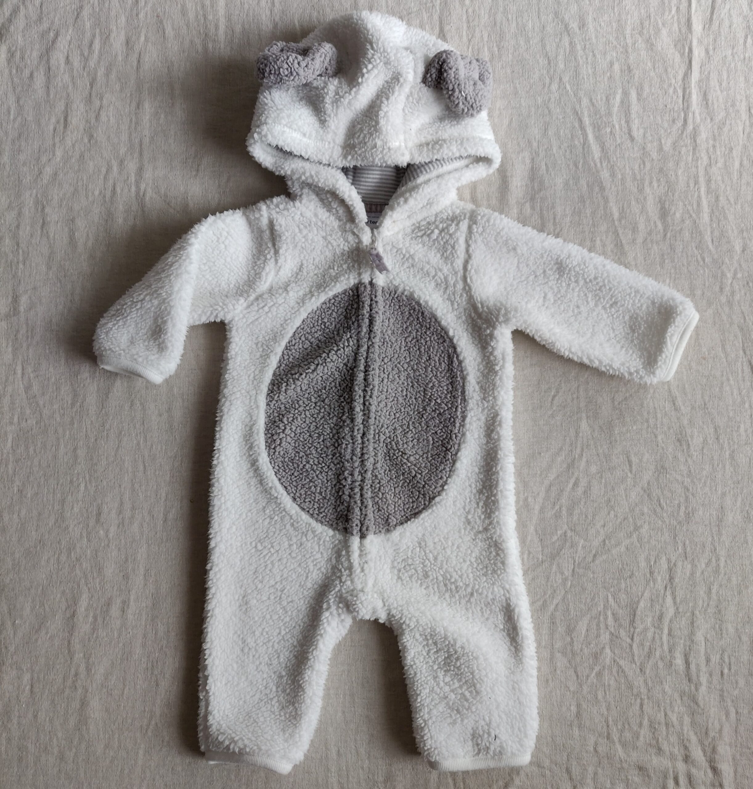 Autres commentaires : Combi-pilote blanc et gris. Bonnet intégré, sans pied. Peut servir de sur-pyjama.