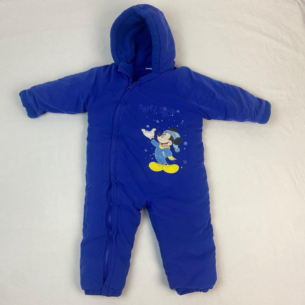 Autres commentaires : 8% Polyamide, Combi-pilote bleu indigo sans moufles, doublure intérieure et capuche en polaire bleue, motif Mickey sous la neige avec inscription « HAPPY SNOW », fermeture par zip devant en latéral, pieds manquants (attaches par boutons pression disponibles) donc déclassé de Kiwi à Fraise.