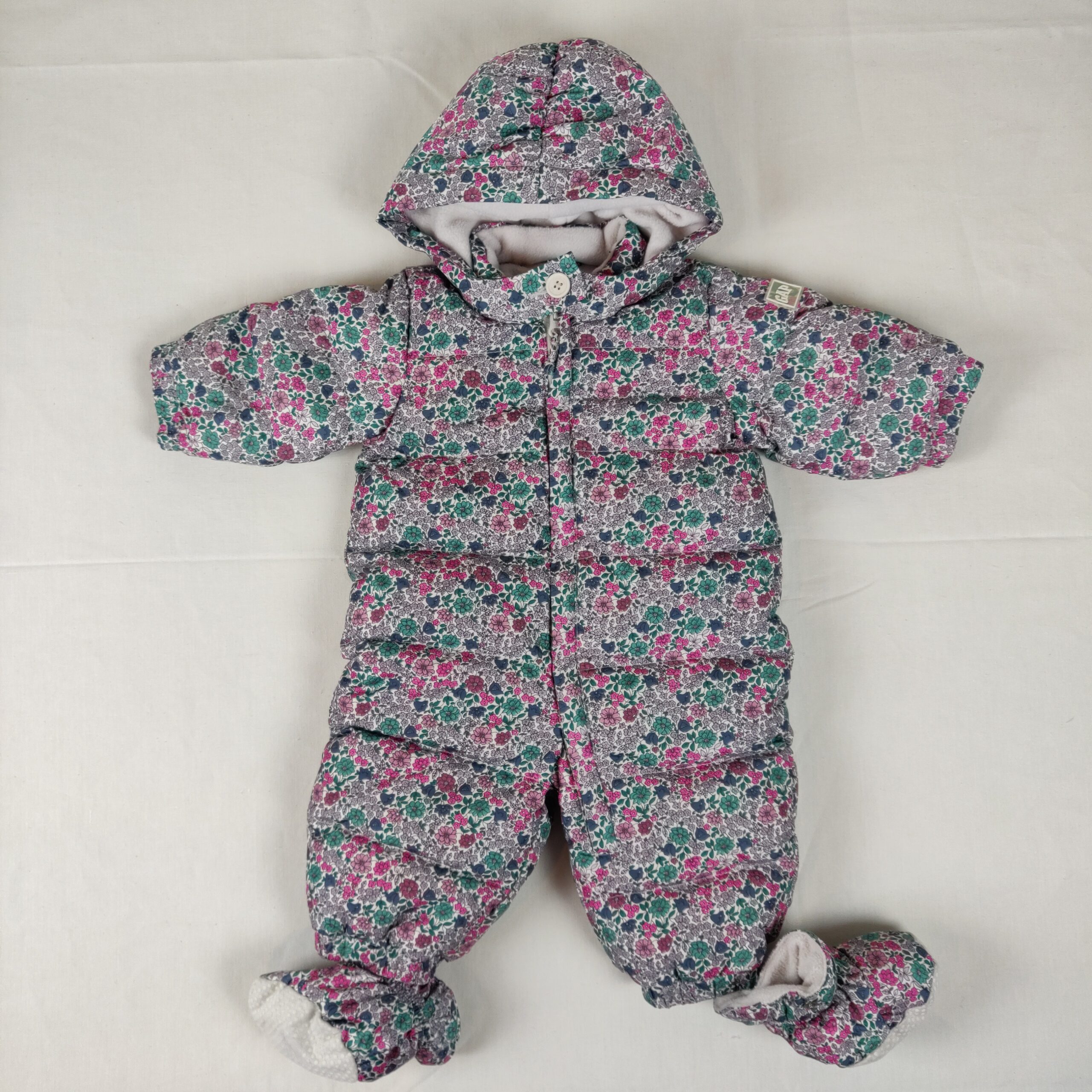 Autres commentaires : Combi-pilote fond blanc à fleurs roses, violettes, lilas et vertes, doublée en polaire, pieds attachés par boutons pressions. Fermeture par zip à l’avant jusqu’au pied. En parfait état.