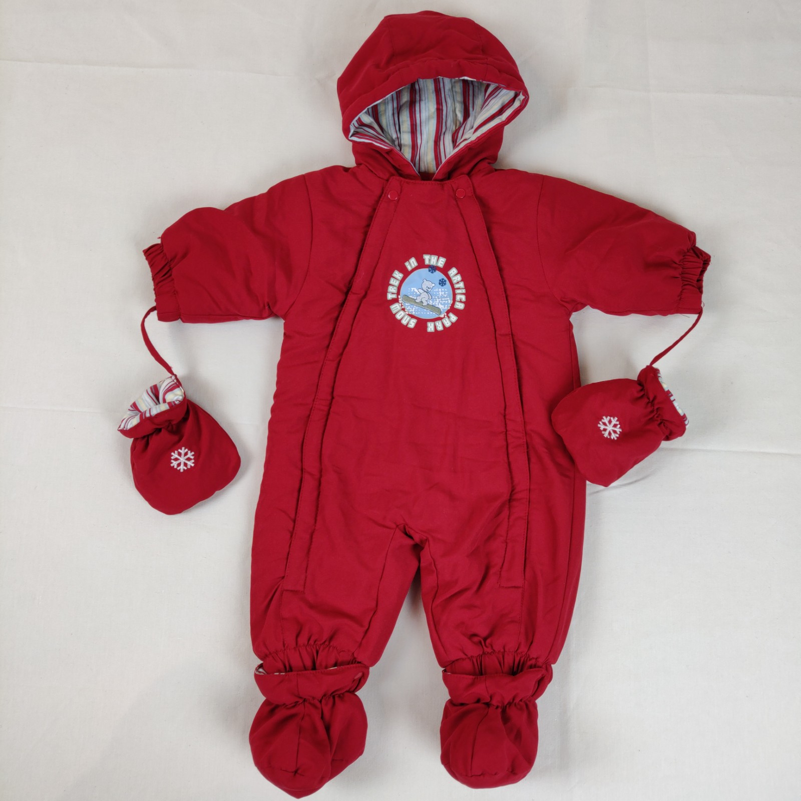 Autres commentaires : Combi-Pilote doublée en polaire à capuche – rouge. Motif central blanc et bleu clair ourson snowboarder avec inscription « Snow trek in the artica park ». Ouverture en trapèze à fermeture éclair et 2 boutons pression dans le haut. Moufles avec motif flocon blanc et pieds amovibles.