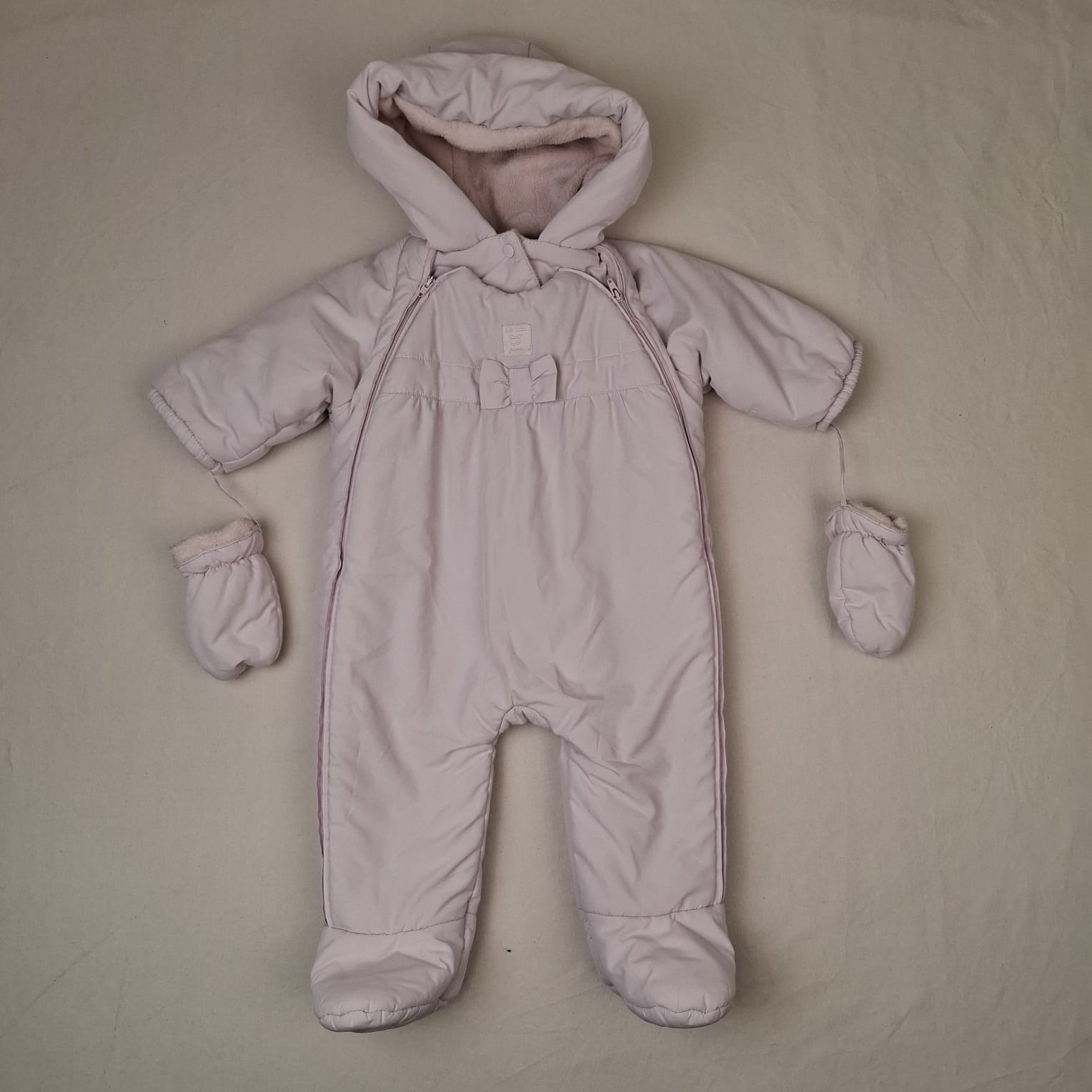 Autres commentaires : Combi-pilote rose pâle avec pieds et capuche, moufles retenues par un cordon, doublure molletonnée écru, fermeture devant par un double zip. Un peu d’usure à l’intérieur de la capuche et peu de peluches d’usage au niveau de la doublure. Niveau réduit de Melon à banane.