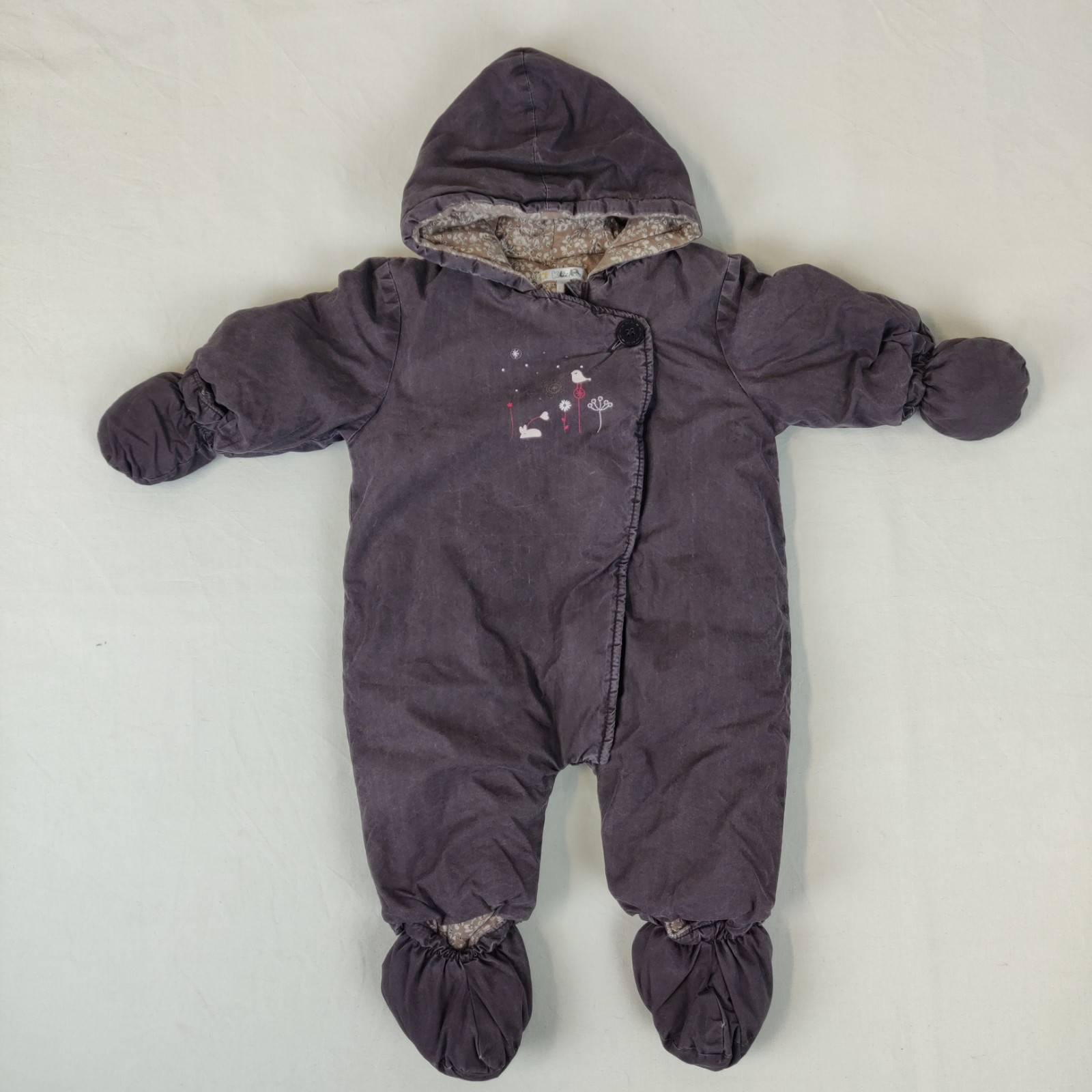 Autres commentaires : Combipilote violet avec capuche et double fermeture par boutons pressions et fermeture en zip. Contient 67% coton et 33% polyamide.