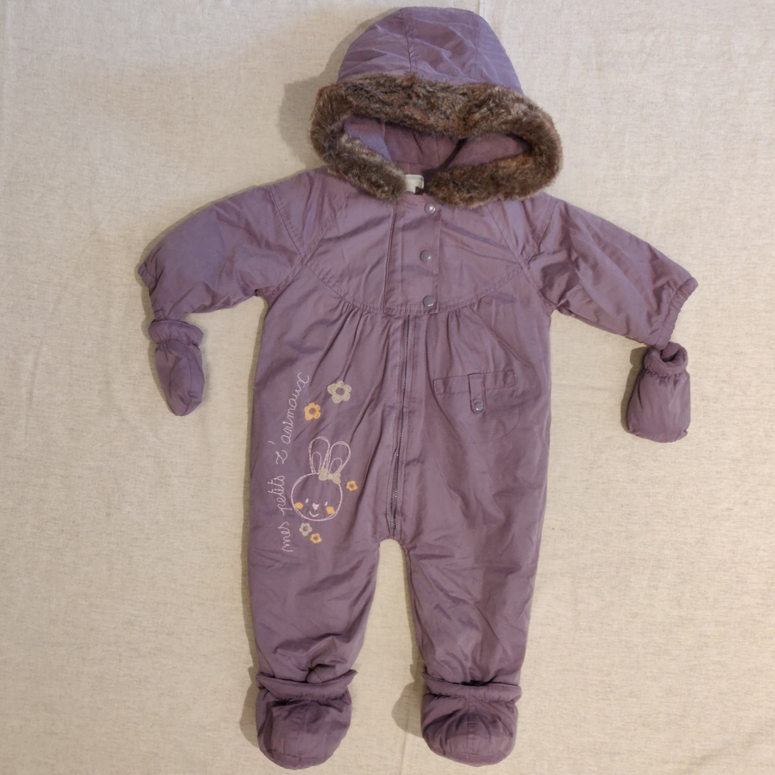 Autres commentaires : 41% coton, 18% polyamide. Doublure et garnissage polyester. Combinaison pilote violette avec capuche doublée à fourrure, moufles et choussons intégrés clipsables par boutons pression, doublure en polaire. Thème « mes petits z’animaux », tête de lalin et fleurs brodés verts et orange. Fermeture par zip plus 3 boutons pression.