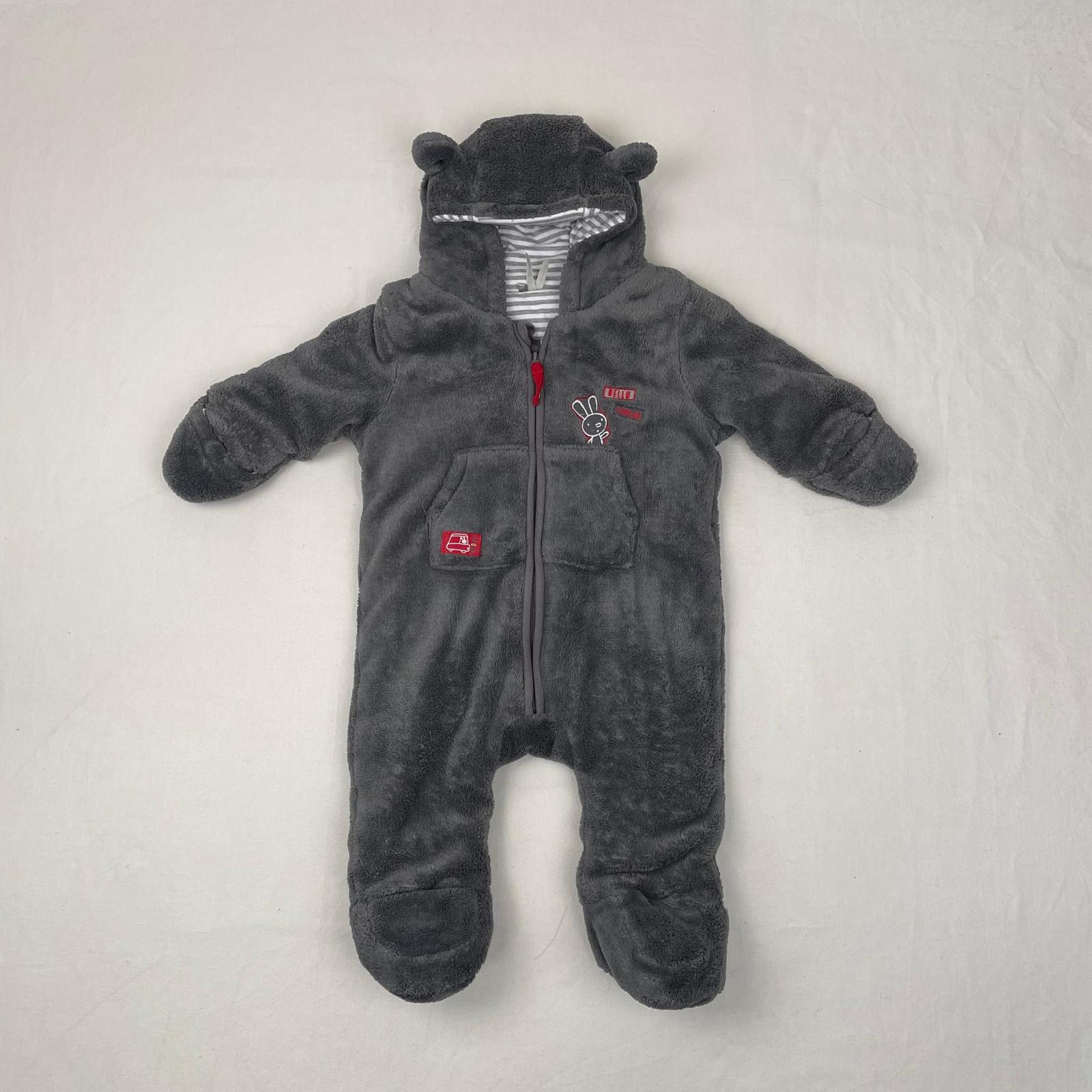 Autres commentaires : Combi-pilote chaude en peluche gris uni avec capuche, doublure en coton, oreilles sur la capuche, fermeture par zip, remplissage 100% polyester.