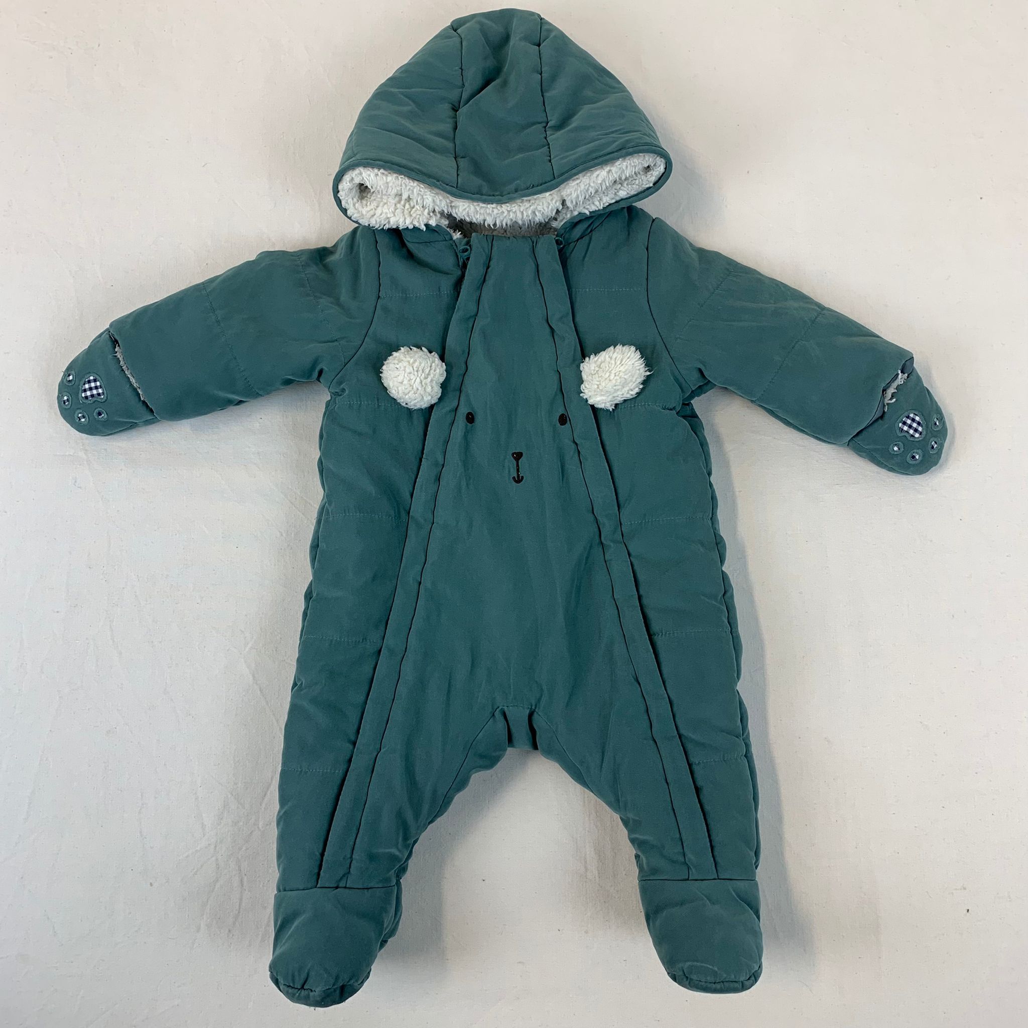 Autres commentaires : Combipilote avec capuche fourrée, doublée en fausse fourrure. Manches doublées en toile polyester – Ouverture centrale par deux fermetures éclair – Zip caché par deux pattes pour garantir l’imperméabilité – Pieds et moufles.Empiècement à carreaux sur les moufles et les pieds en forme de petites pattes d’ourson.
