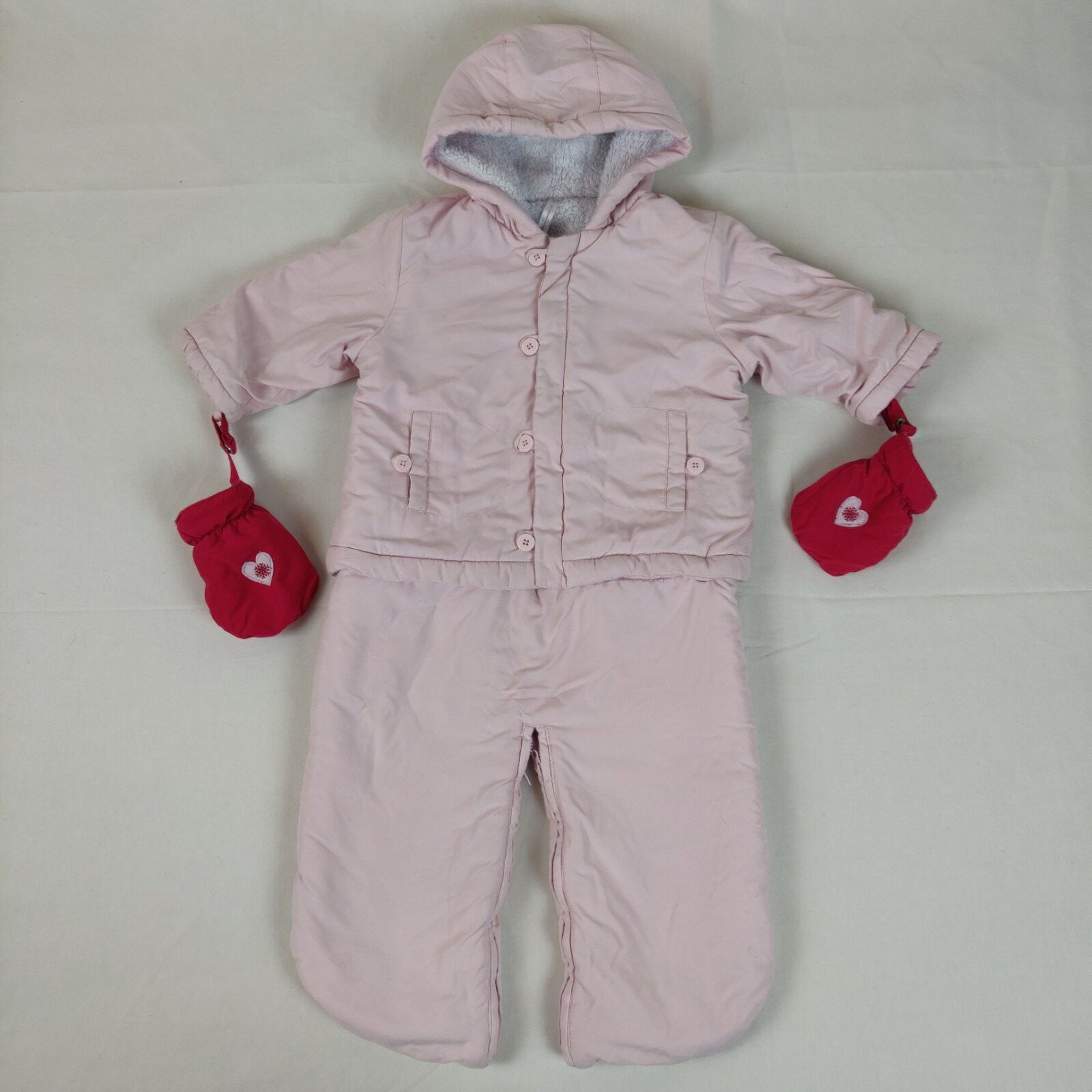 Autres commentaires : 8% polyamide. Combi-pilote en deux parties solidarisables avec des boutons pression. Manteau doublé à capuche et moufles intégrées – rose. Fermeture zippée sous rabat à boutons. 2 poches latérales. Pantalon à pieds. Fermetures zippées à l’entrejambe.