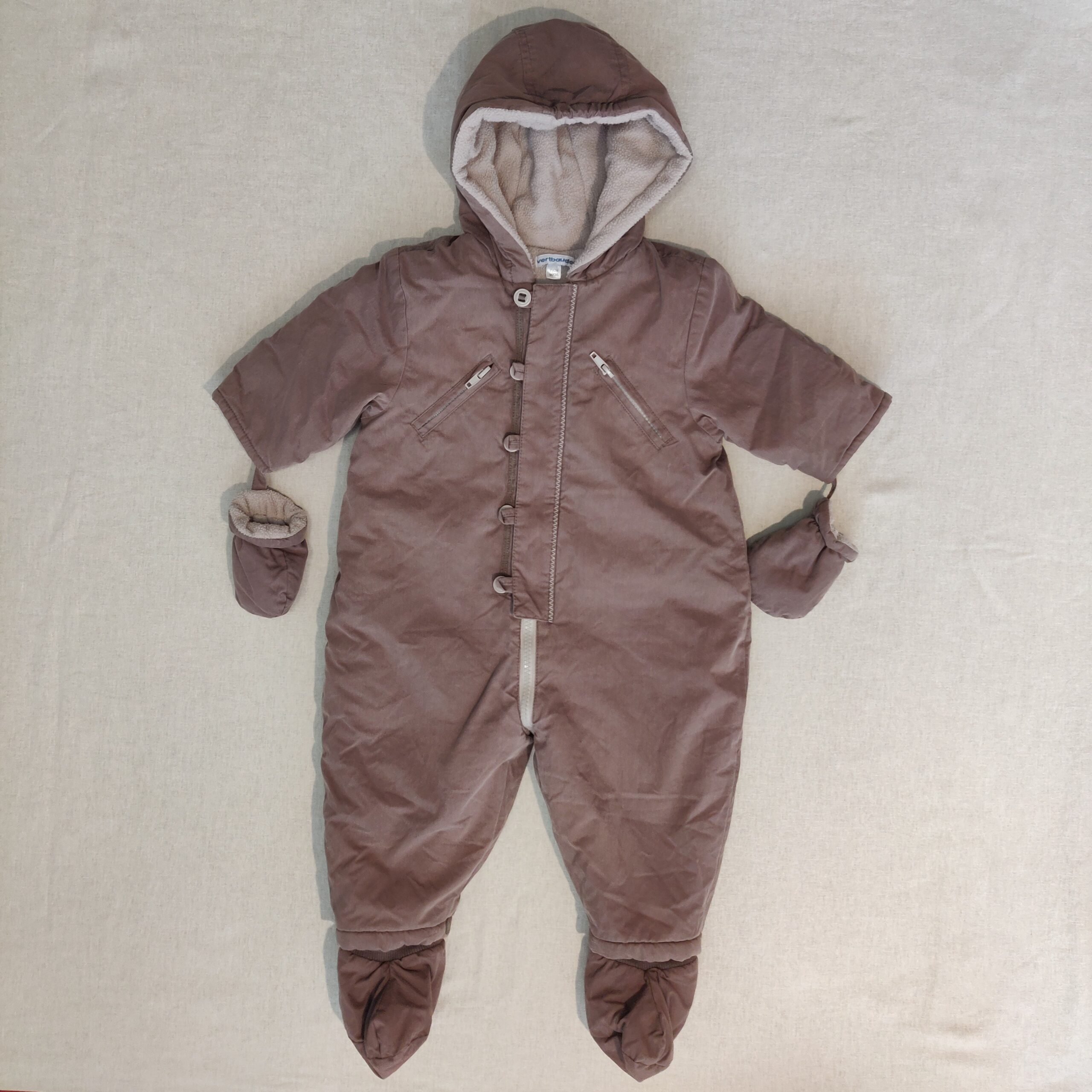 Autres commentaires : Extérieur coton 70% , polyamide 30%. Doublure polyester. Combinaison couleur taupe, fermeture par zip et boutons extérieurs. Moufles et chaussons intégrés