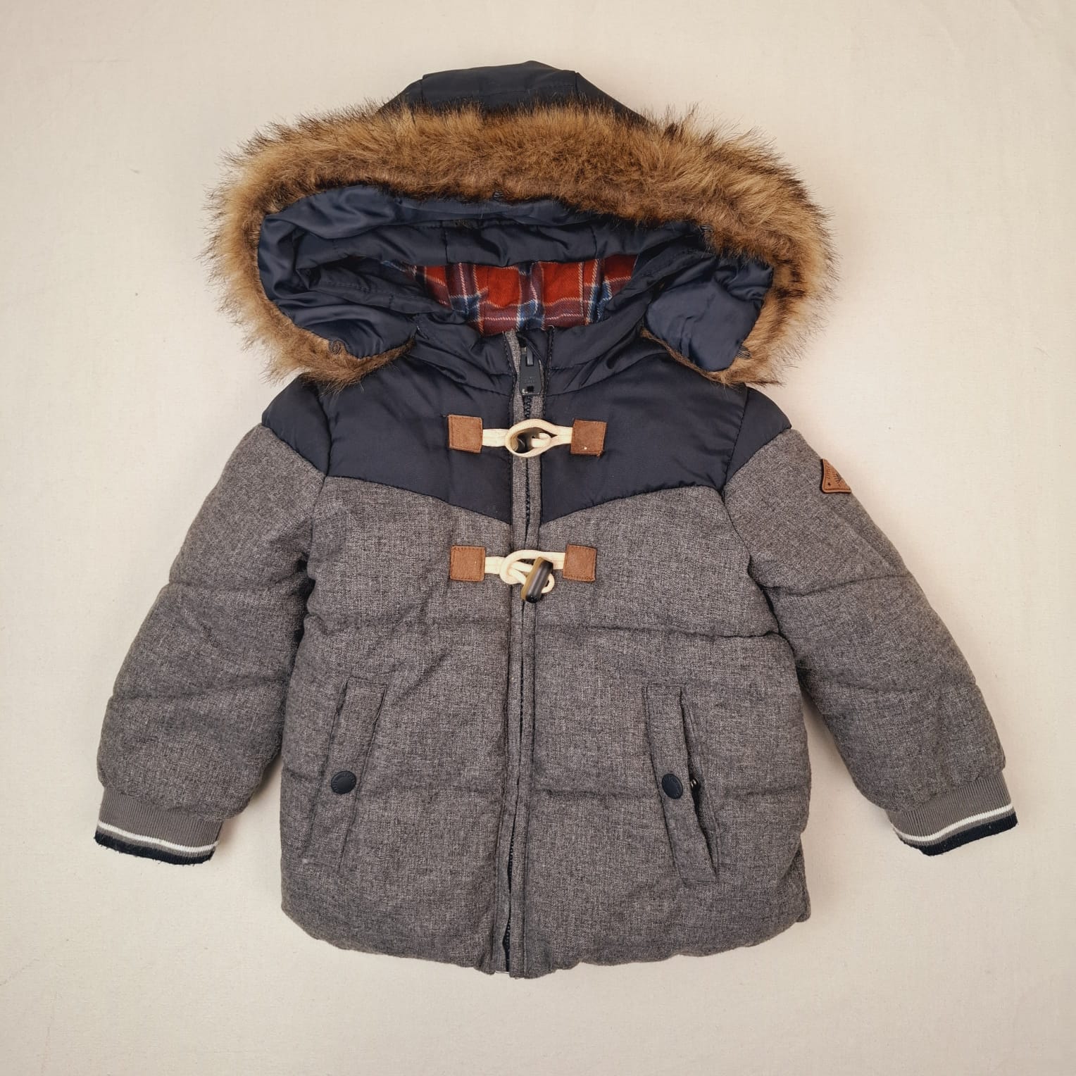 Autres commentaires : Doudoune gris foncé avec capuche , haut bleu foncé, 2 poches latérales, poignets elastiques, col montant, fausse fourrure amovible sur la capuche par boutons, fermeture par zip et 2 boutons Brandebourg.