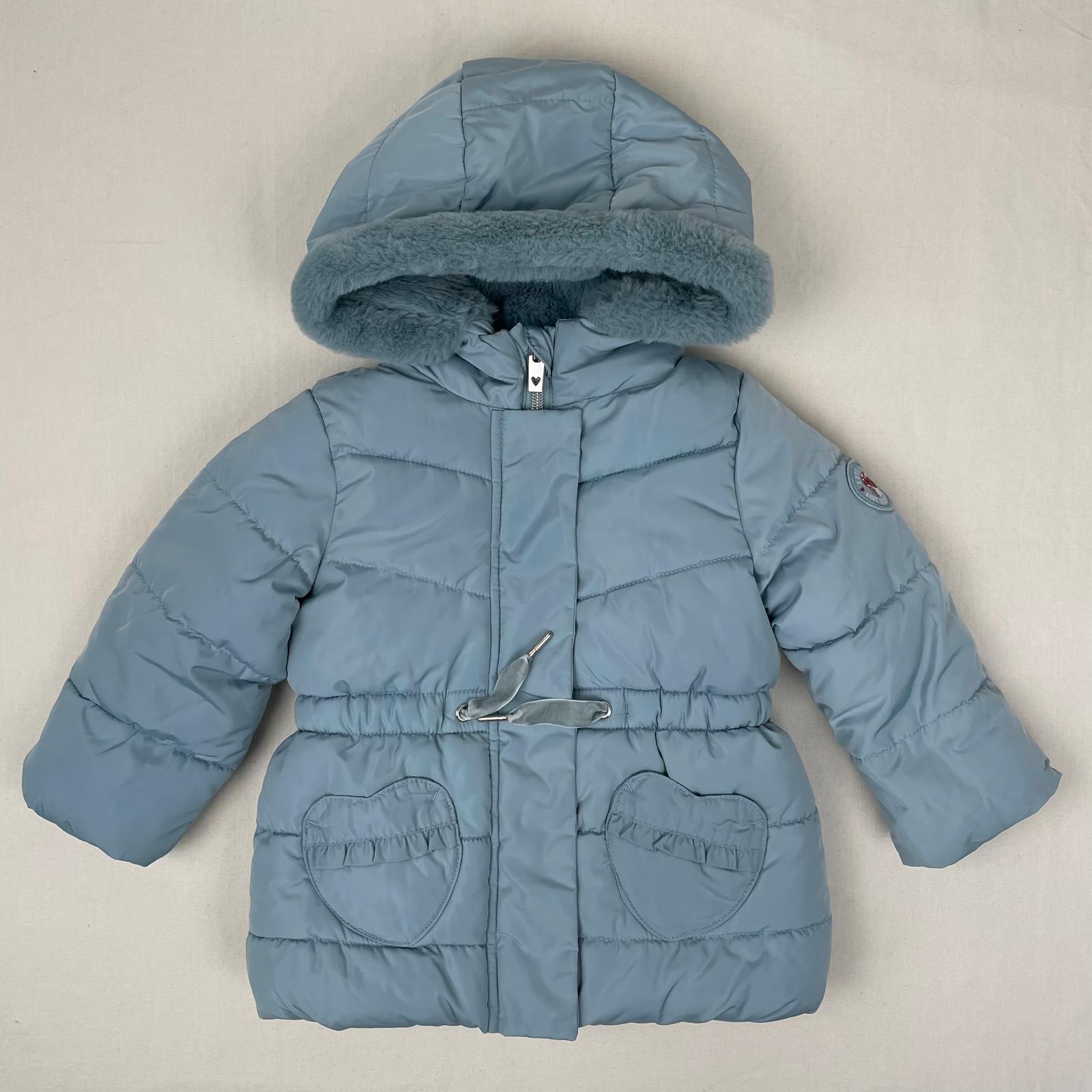 Autres commentaires : Doudoune bleue rembourée avec fermeture éclair et fourrure sur la capuche.