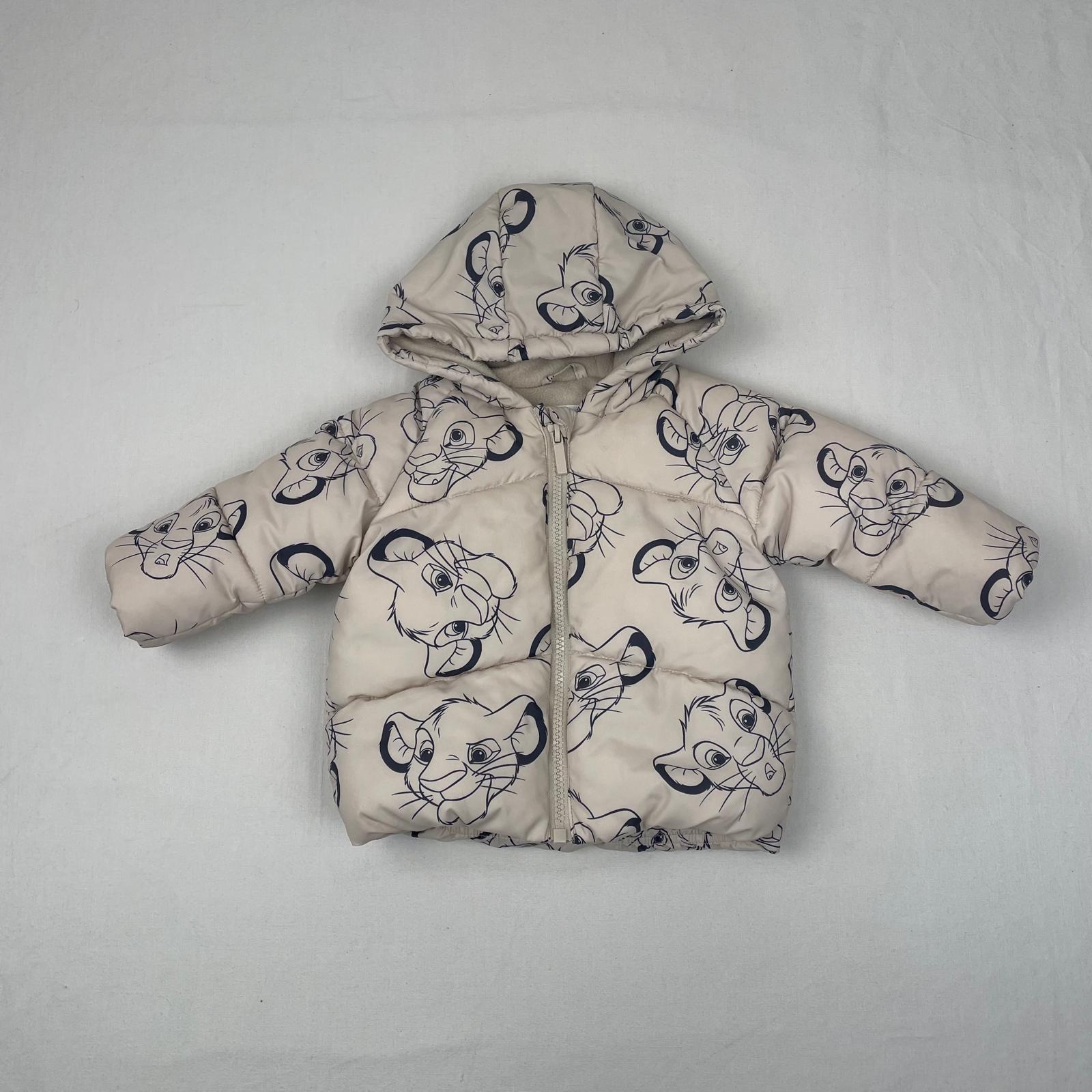 Autres commentaires : Doudoune beige à capuche, doublure en polaire beige, fermeture devant par zip, motifs personnage de Disney en noir.