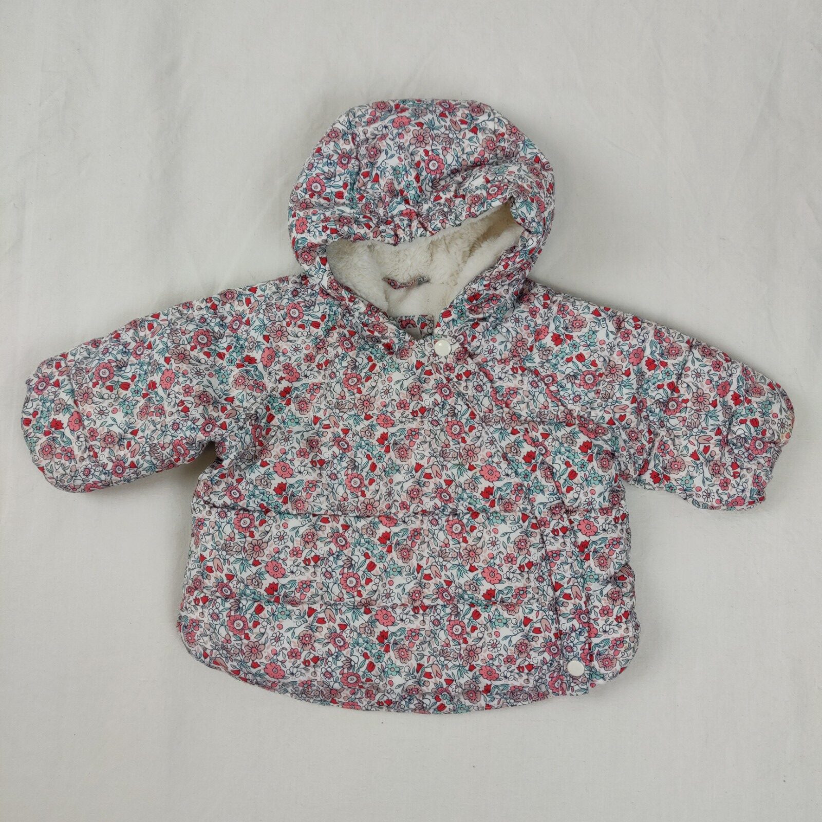 Autres commentaires : Doudoune fleuri rouge, vert et rose avec capuche et une fermeture devant double en zip et par boutons pressions.