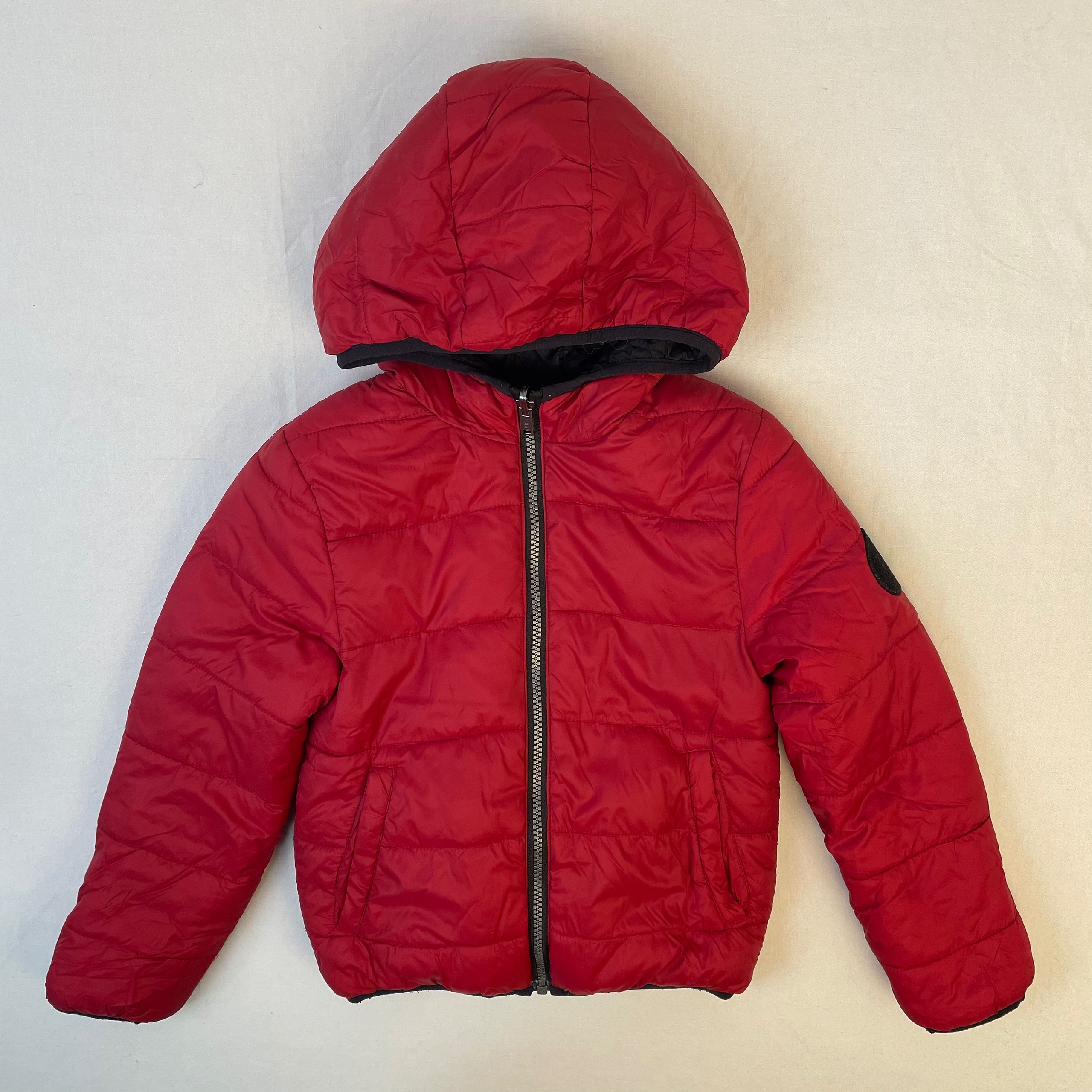 - Doudoune noire réversible en rouge, à capuche, zip central, taille environ 5 ans.