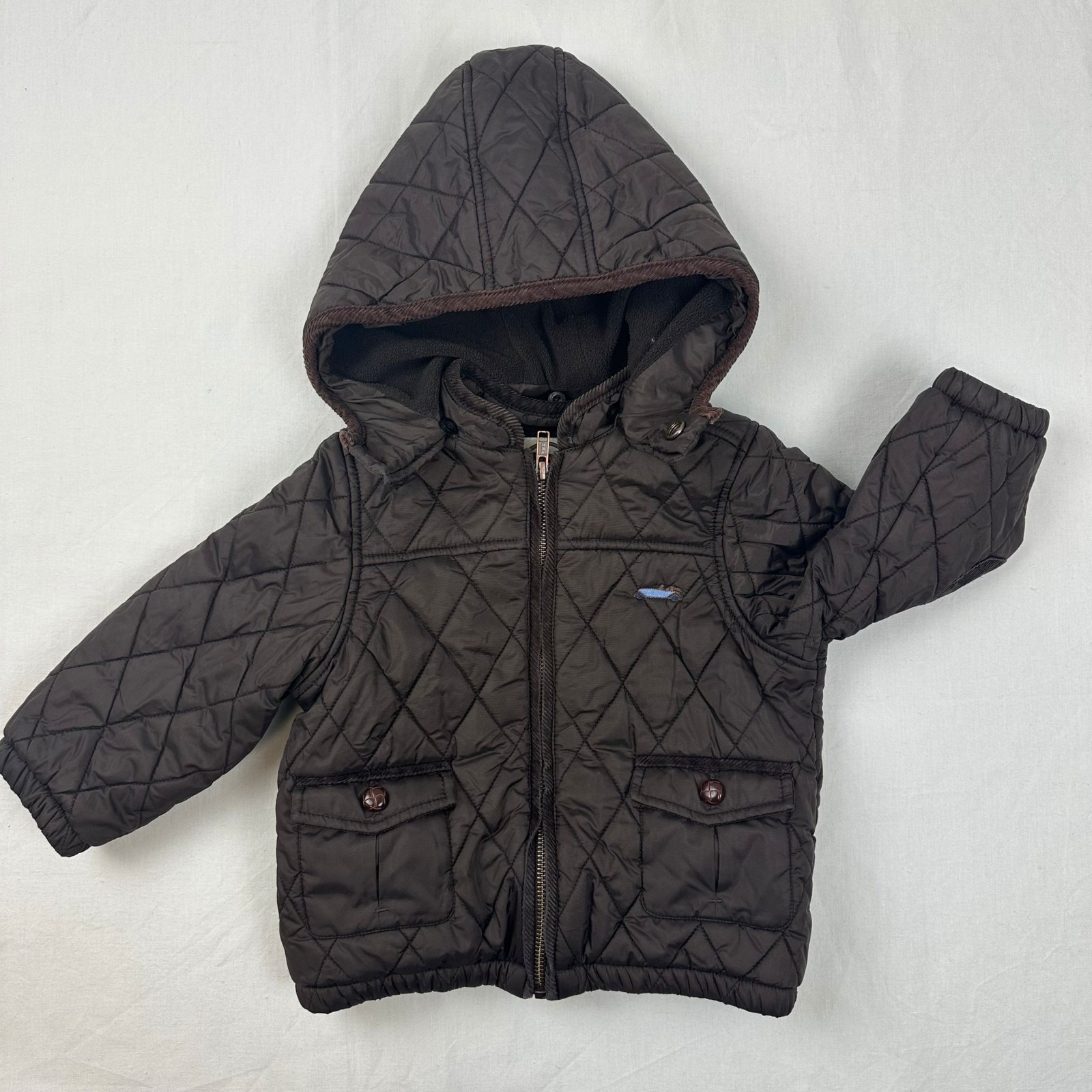 Autres commentaires : Doudoune marron manches longues avec capuche détachable et une fermeture devant en zip.
