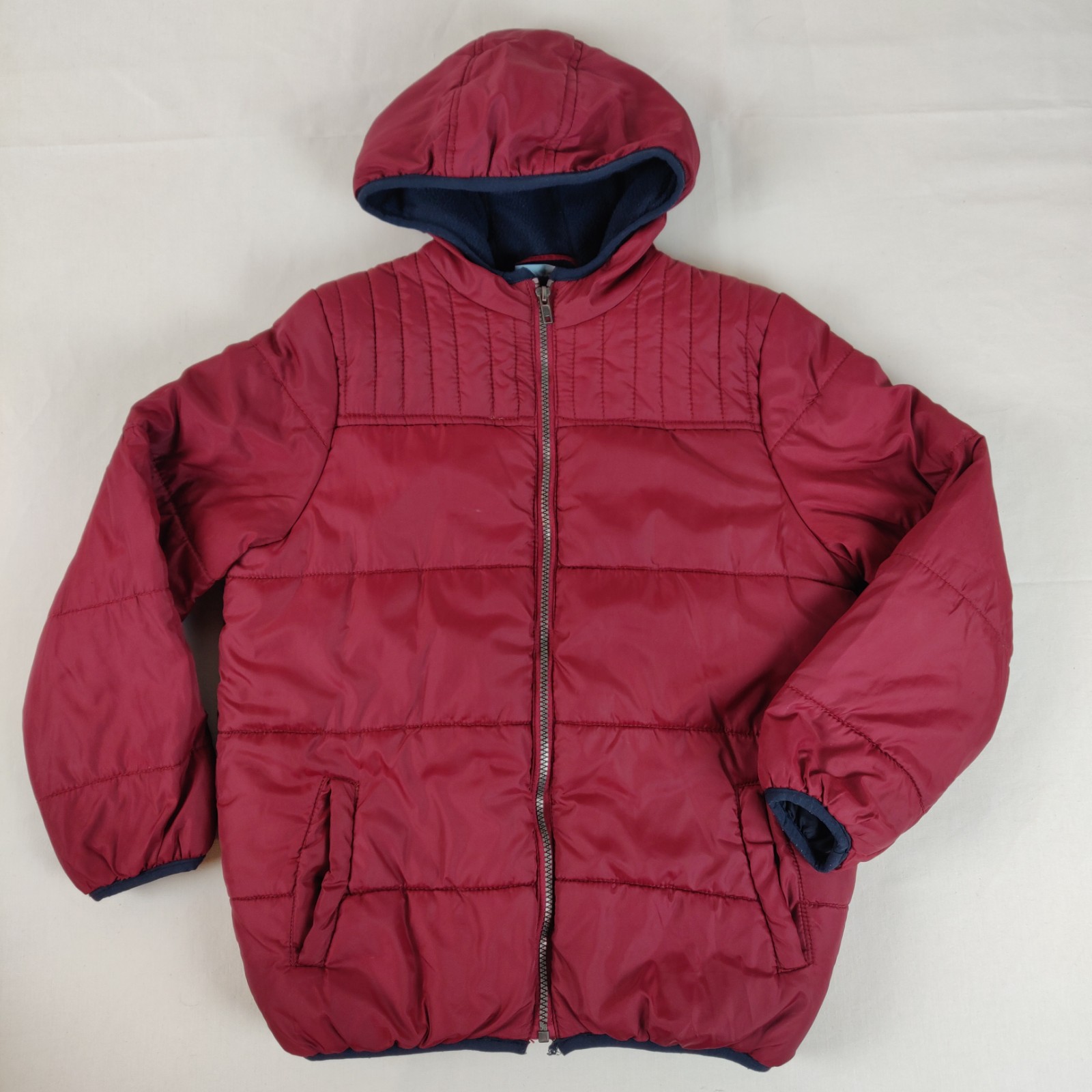 Autres commentaires : Doudoune doublée en polaire à capuche – bordeaux. Ouverture centrale zippée. 2 poches latérales. Inscription centrale au dos légèrement effacée « Major league. Estab 1838 NKY. New york. Basketball team dept. First competitor ». Quelques tâches pratiquement invisibles sur la manche droite. Très léger accro de 2 mm d’épaisseur à l’arrière de la manche gauche.