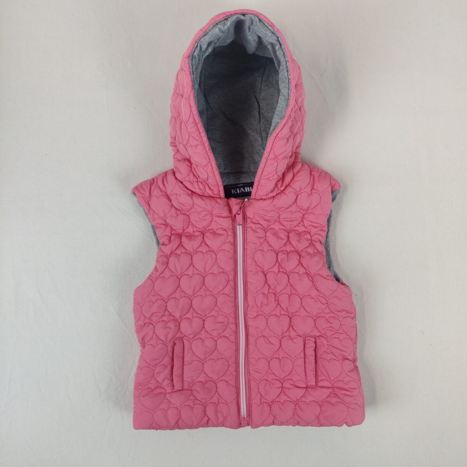 Autres commentaires : Doudoune sans manche et à capuche matelassée à motifs coeurs roses. Ouverture centrale zippée.