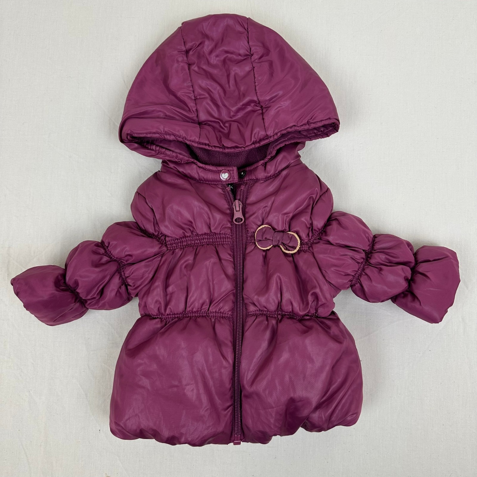 Autres commentaires : Doudoune violet avec capuche et une fermeture en zip et un bouton pression sur le col.Motif: petit noeuds sur le côté.