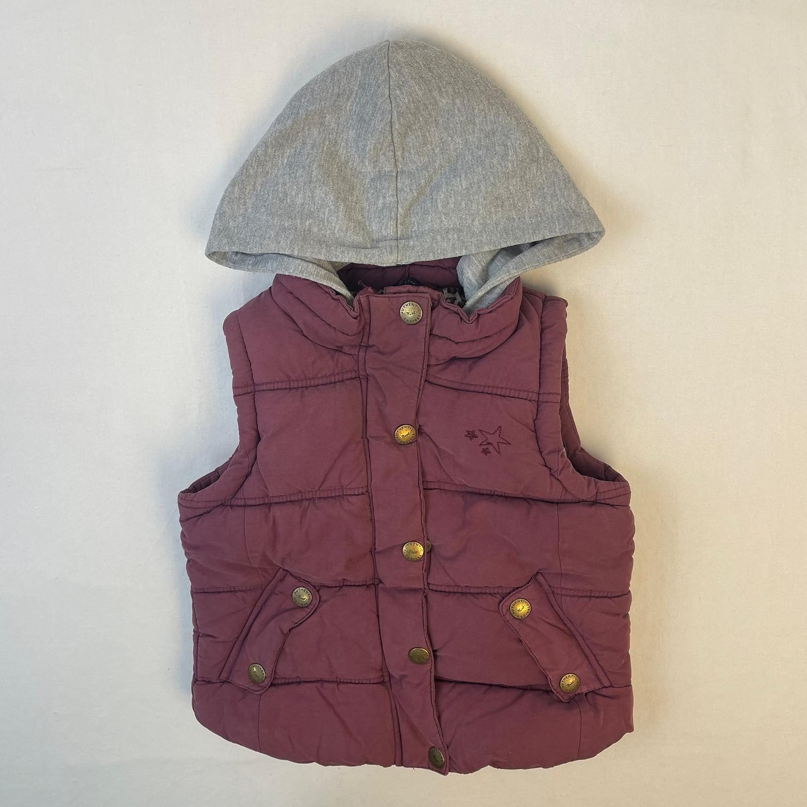 - Doudoune sans manche bordeaux avec capuche grise. Fermeture par zip et boutons pression.