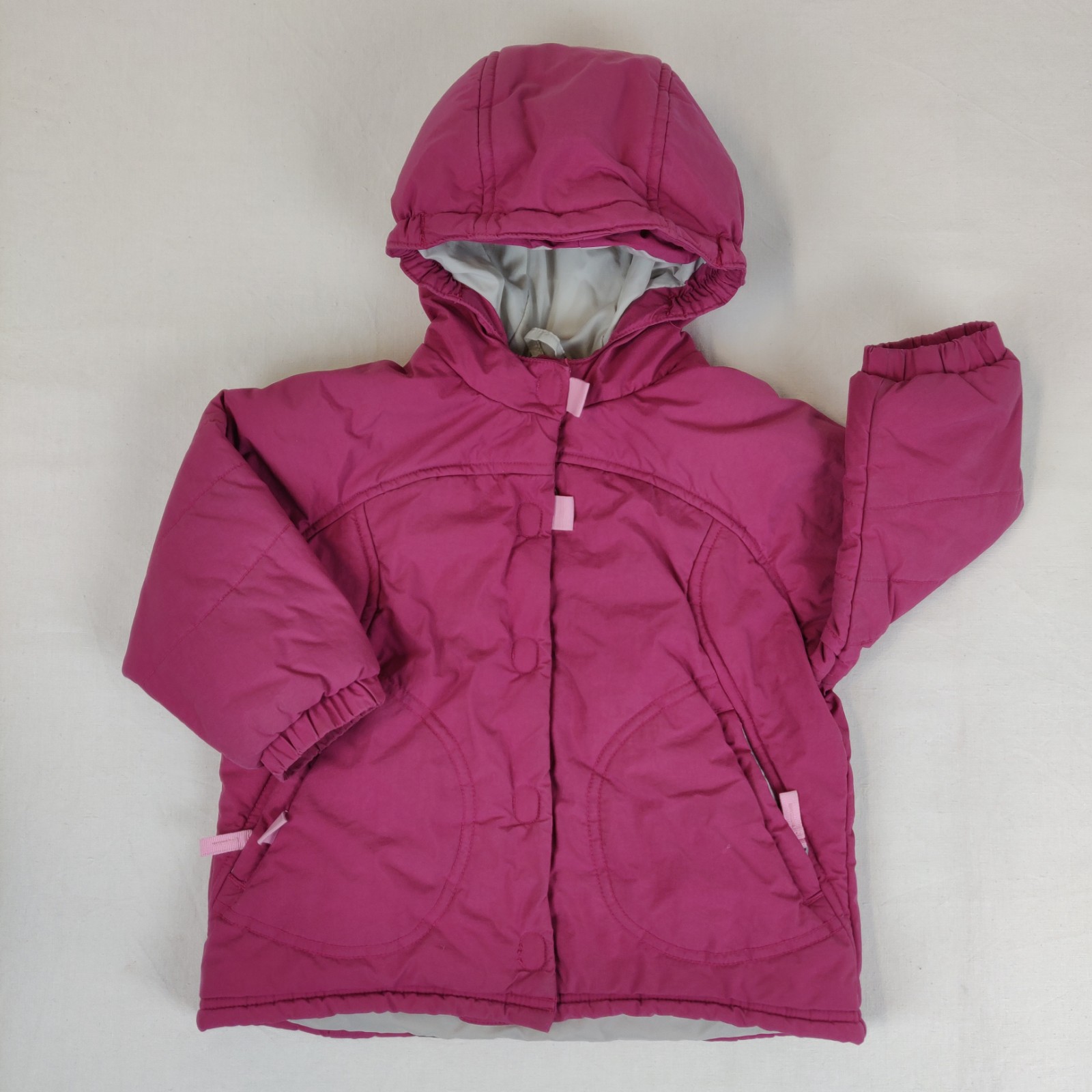 Autres commentaires : Doudoune à capuche rose en polyester synthétique avec deux petites poches en bas et une fermeture zip.