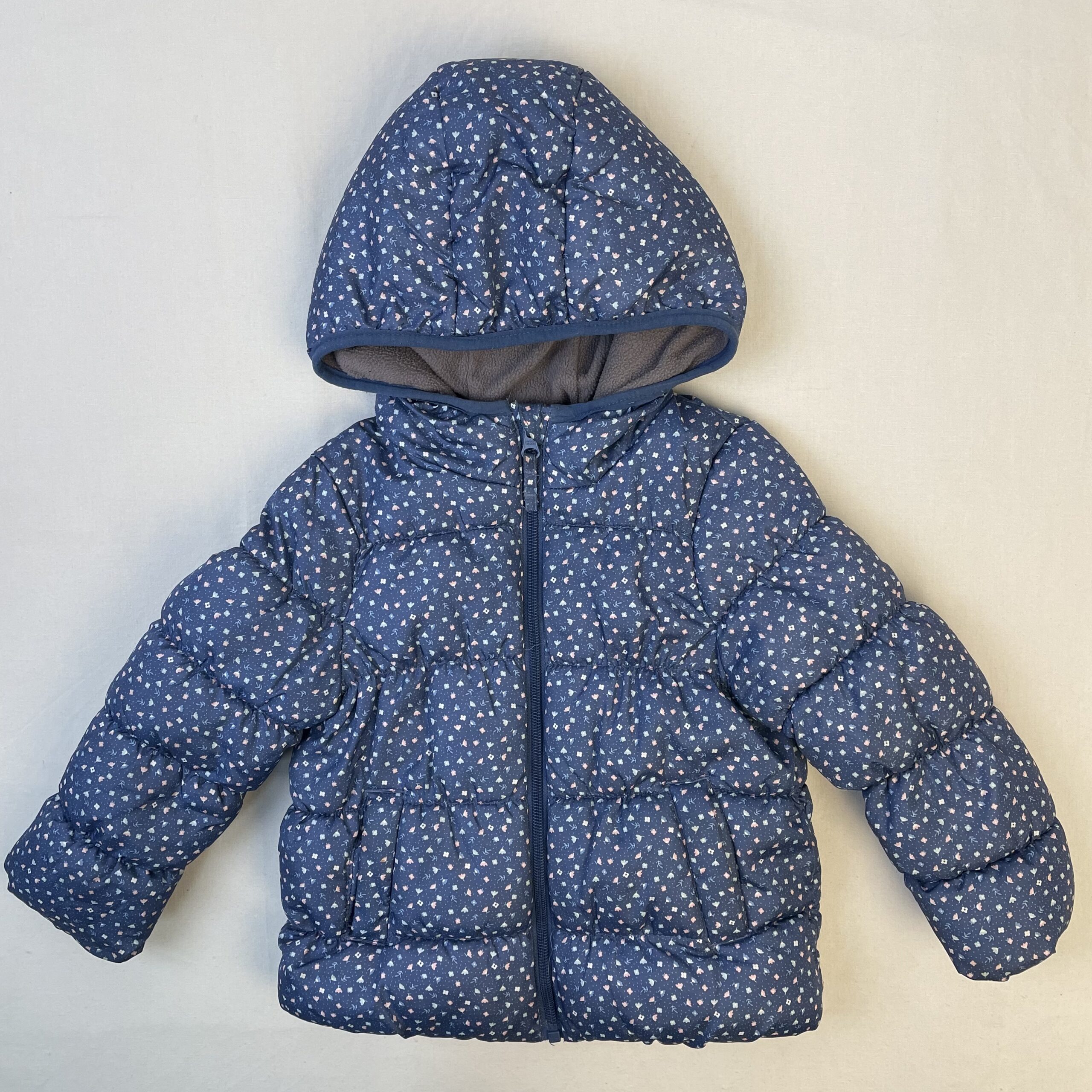 - doudoune bleue rembourrée, parsemée de fleurs roses et bleues