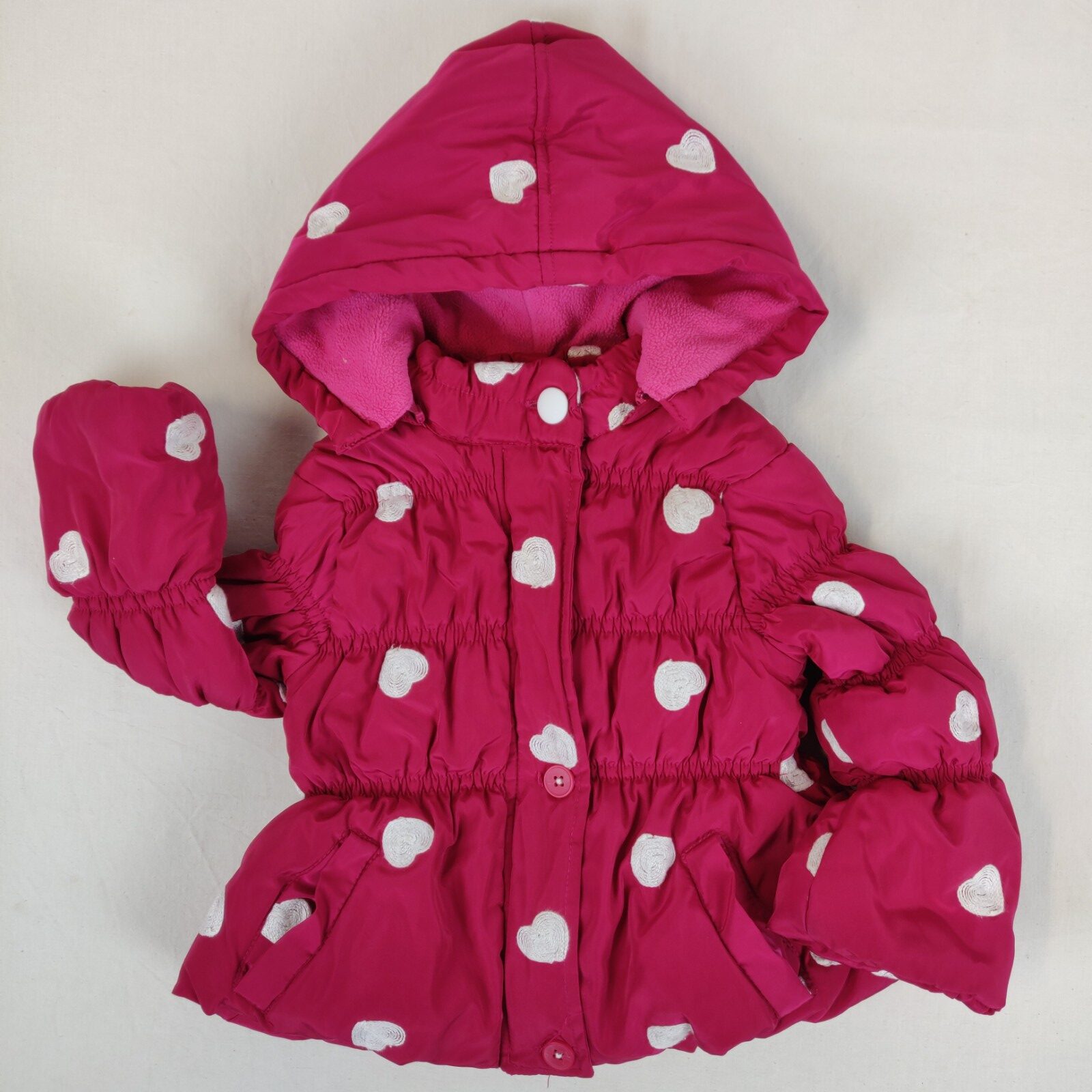 Autres commentaires : Doudoune rose à capuche imperméable avec fermeture zip et fermerure simple . Contient 100% de polyester et illustré des petits motifs blancs sous forme de coeur.