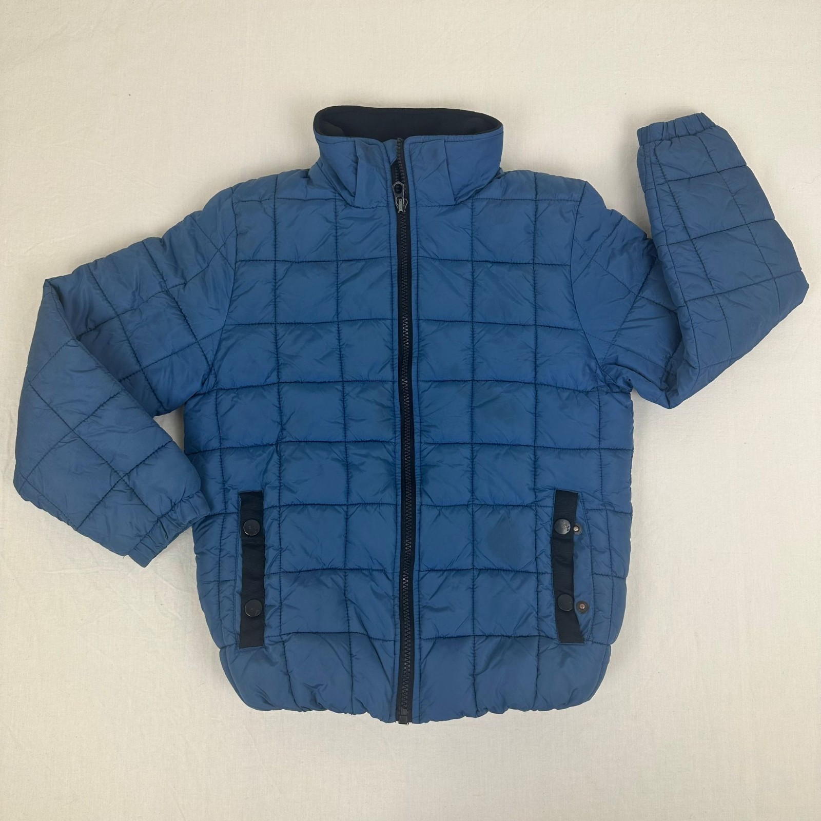 Autres commentaires : Doudoune bleu col céminé avec une fermeture en zip. Petit défaut: petite tâche sur la doudoune et sur le col. Niveau reduit de Fraise à Myrtille.