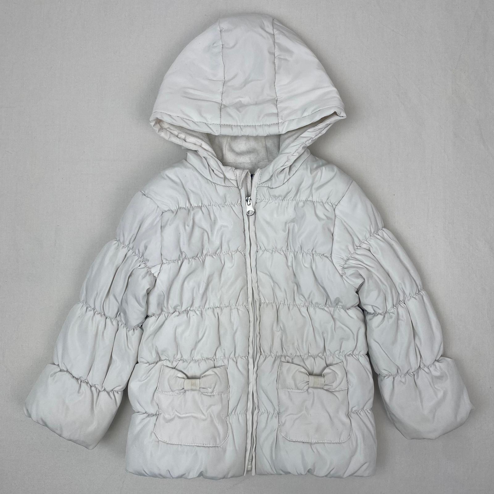 Autres commentaires : Doudoune blanche à manches longues et capuche, fermeture par fermeture éclair. Petit défaut : traces d’usures un peu partout sur la doudoune principalement sur le dos. Niveau réduit de Fraise à Myrtille.