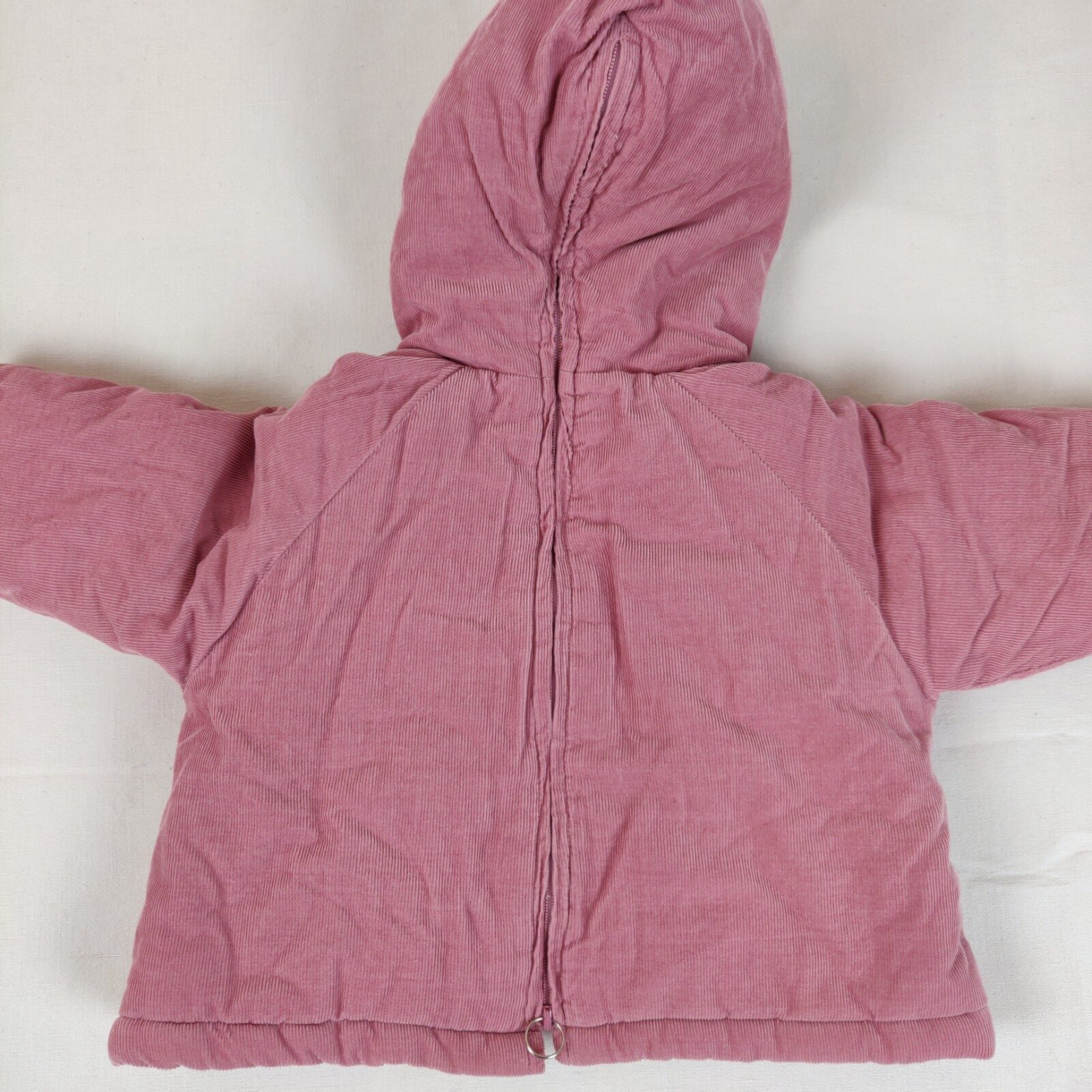 Autres commentaires : Manteau burnous doublé et garni en velours côtelé – rose – à capuche. Fermeture centrale au dos et à la capuche montée à l’envers. Pochette centrale.