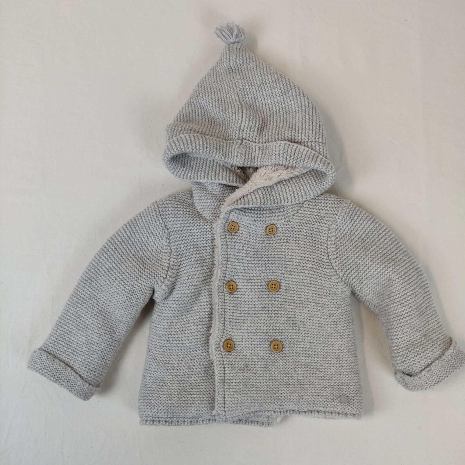 Autres commentaires : 29% polyamide, 26% viscose, 8% laine, 4% angora. Manteau en maille gris clair, à capuche pointue, doublé en polyester style moumoute écru. Double boutonnage à l’avant.