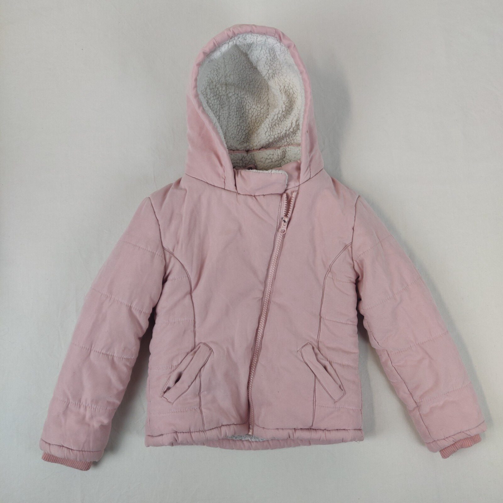 Autres commentaires : 20% polyamide. Manteau à capuche doublé en fourrure synthétique – rose. Ouverture centrale zippée. 2 poches latérales. 2 mini tâches bleues près des poches. La doublure est tâchée dans le bas. Niveau réduit de fraise à myrtille.
