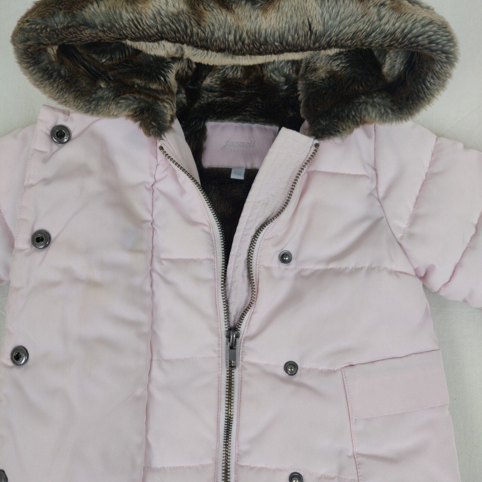 Autres commentaires : Manteau rose doublé fausse fourrure marron, capuche chaud. Très bon état mais tâches jaunies sur le devant formant une décoloration discrète mais visible en fonction de la lumière. Niveau réduit de Banane à Kiwi.