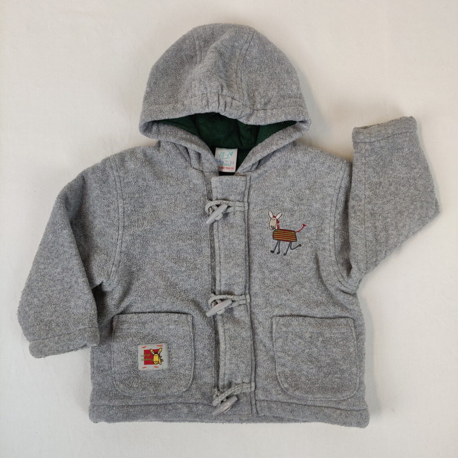 Autres commentaires : Manteau doublé à capuche en polaire grise. Ouverture centrale zippée sous rabat à fermeture duffle coat. Motif central brodé âne. 2 poches centrales dont une décorée d’un écusson avec un âne et l’inscription « Mister donkey ». Usure normale.