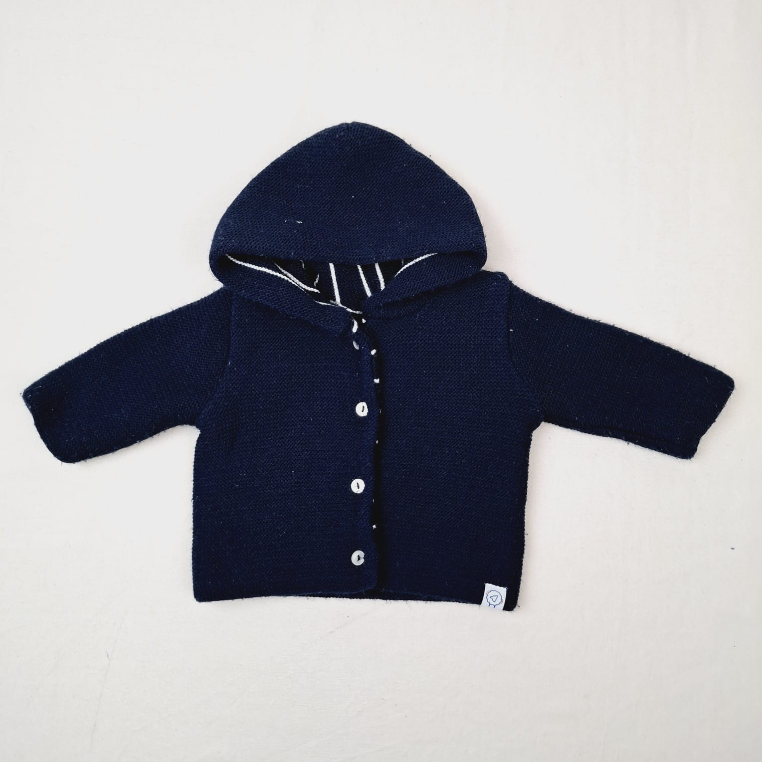 Autres commentaires : Manteau en tricot à capuche, point mousse, bleu marine uni, doublure bleu marine à rayures blanches, fermeture devant par petits boutons. Bon état mais un peu de peluches de frottement.