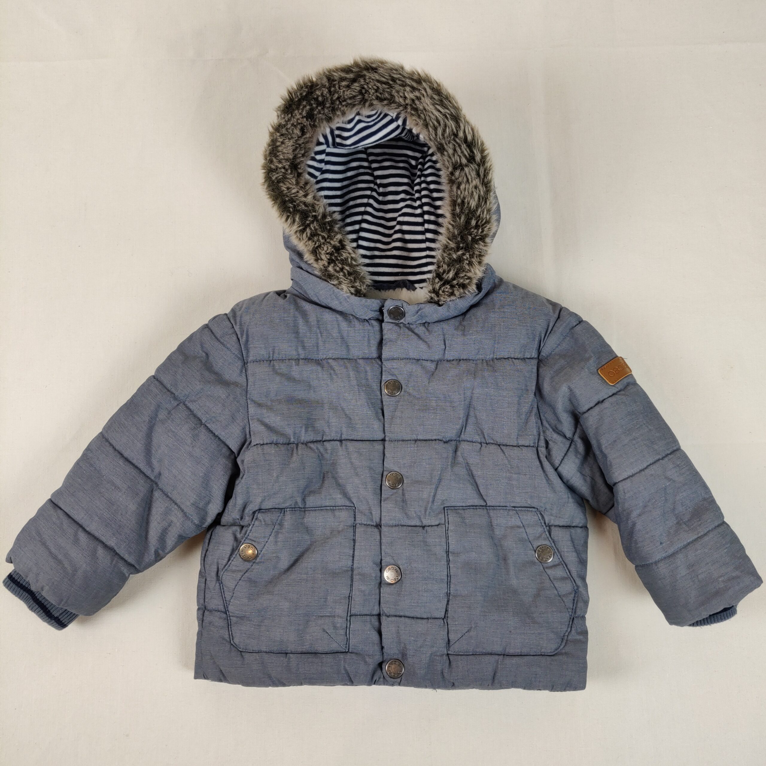 Autres commentaires : Manteau doublé en polaire à capuche ornée de fourrure synthétique marron – bleu-gris. Ouverture centrale zippée sous rabat pressionné. 2 poches latérales. Très disrète tâche au dessus de la poche gauche.