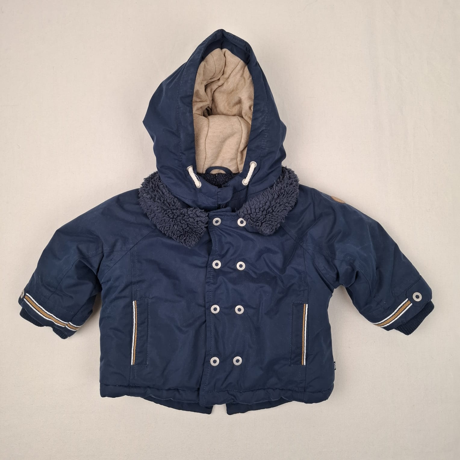 Autres commentaires : Blouson Obaibi 6M bleu avec capuche double fermeture boutons pression à l’avant , poignets élastiquée , intérieur rembourré