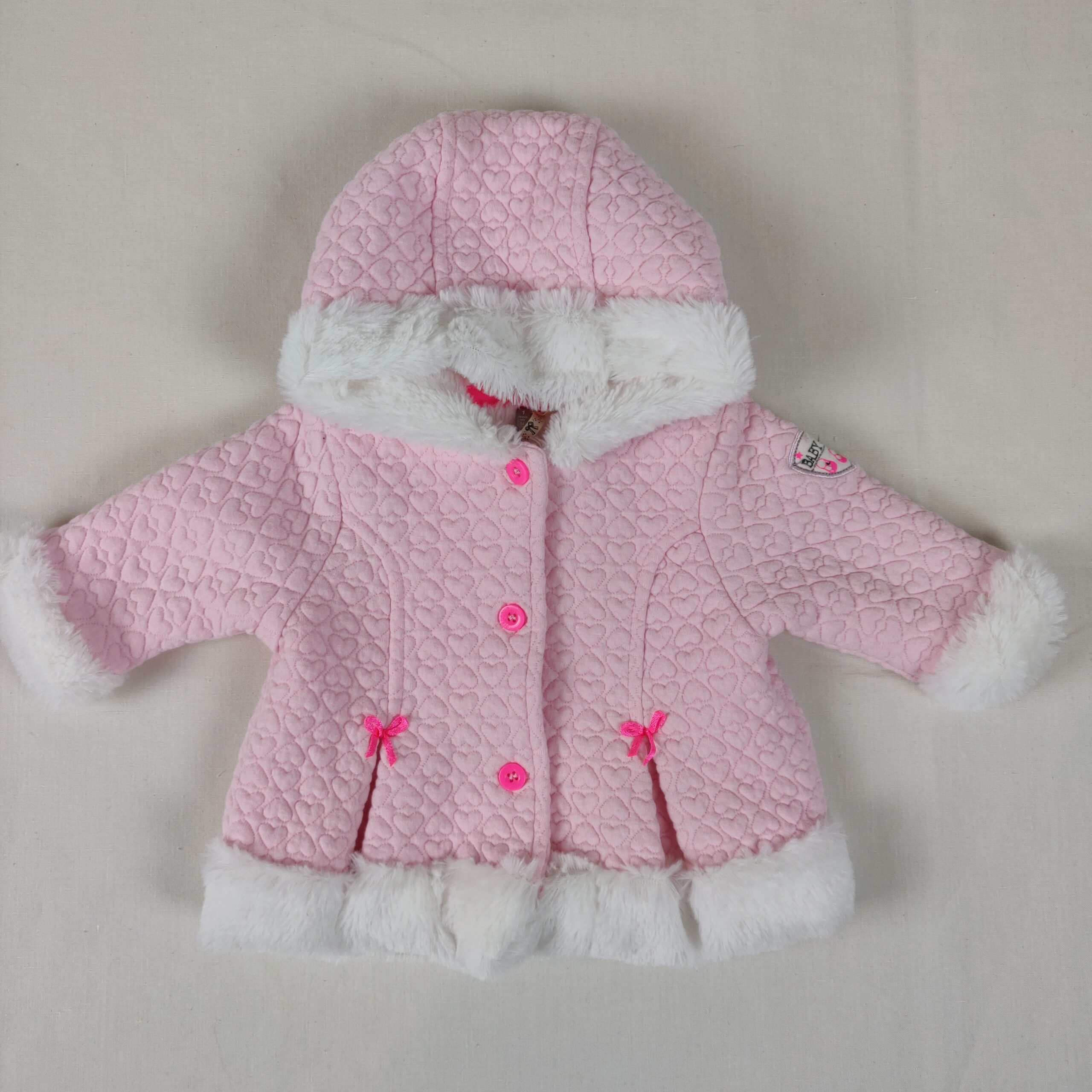 Autres commentaires : Manteau à capuche, extérieur rose en moletons à motif coeurs et noeuds rose bonbon brodés sur les volants. Fermeture par 3 boutons roses bonbon. Intérieur et doublure de la capuche en fausse fourrure blanche, très chic.