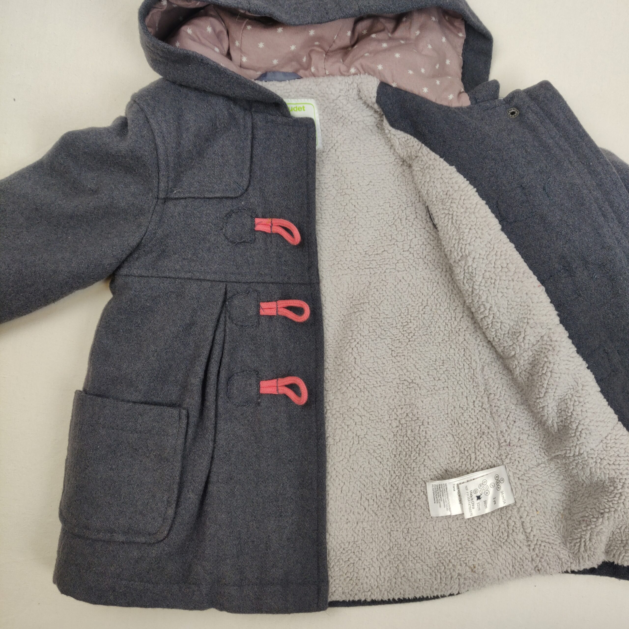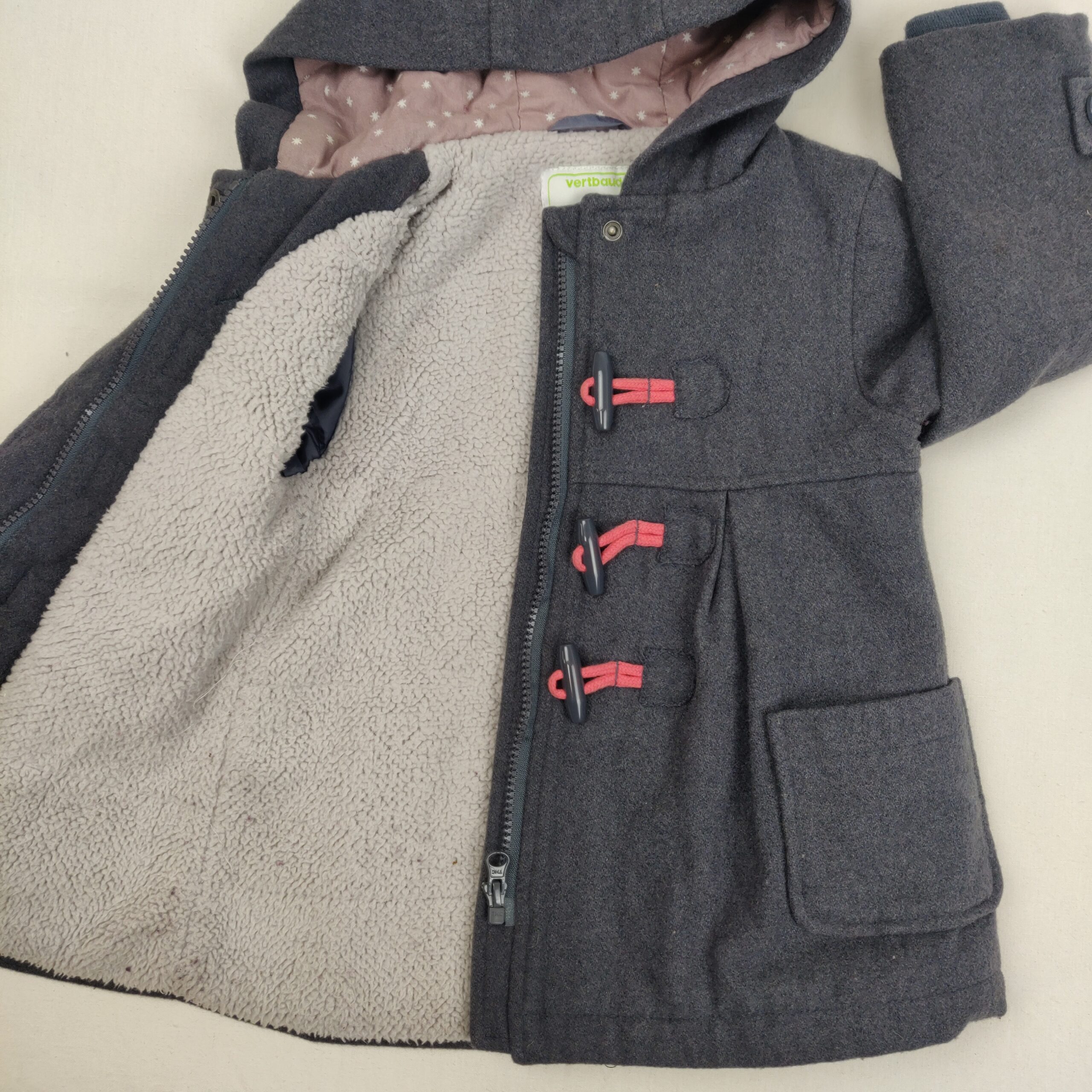 Autres commentaires : Manteau en laine (extérieur 60% laine et 40% polyester), style duffle coat, froncé devant, forme un peu évasée, fermeture par zip avec rabat à boutonnage brandebourgs roses, capuche doublée en jersey 100% coton rose avec petites étoiles blanches, doublure chaude en sherpa en 100% polyester, doublure élastiquée aux poignet, patte de boutonnage grise décorative sur chaque manche.