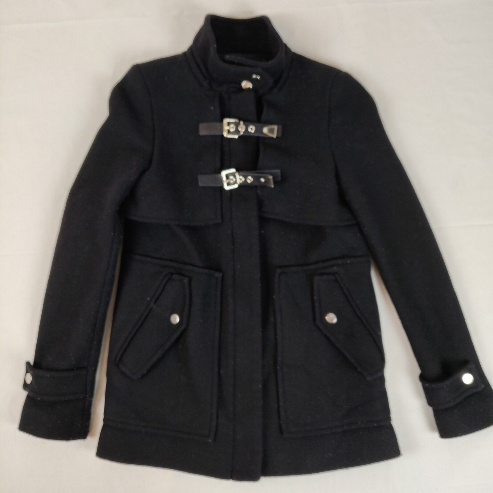 Autres commentaires : Manteau (taille XS) – noir – ouverture centrale à fermeture éclair métallique avec rabat de tissu. 2 battants centraux se fermant avec deux lanières ajustables. Col montant se fermant à deux boutons pression. 2 poches latérales. Effet pelucheux.