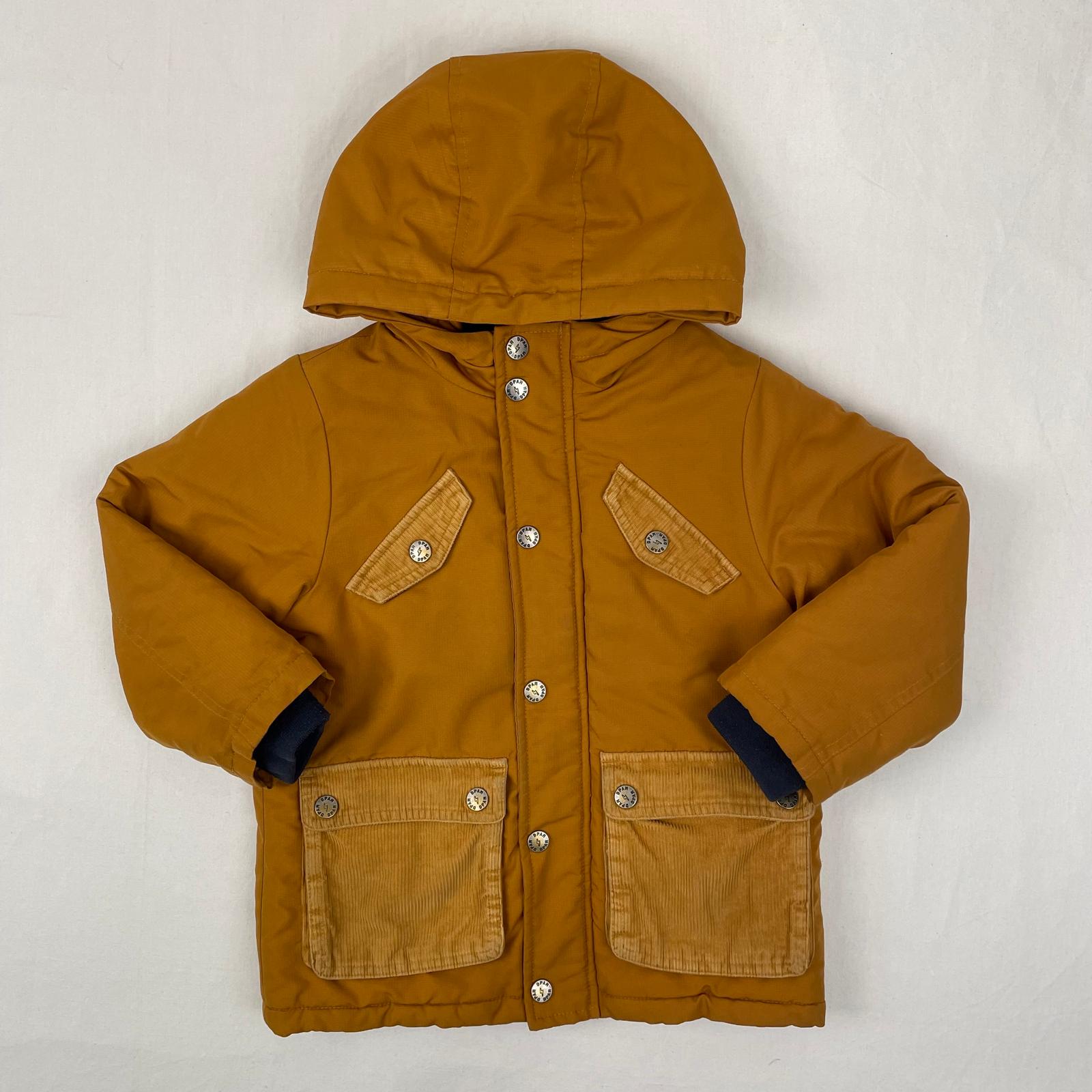 Parka couleur moutarde à capuche, fermeture par zip puis boutons-pression. Intérieur en fausse fourrure bleu marine.