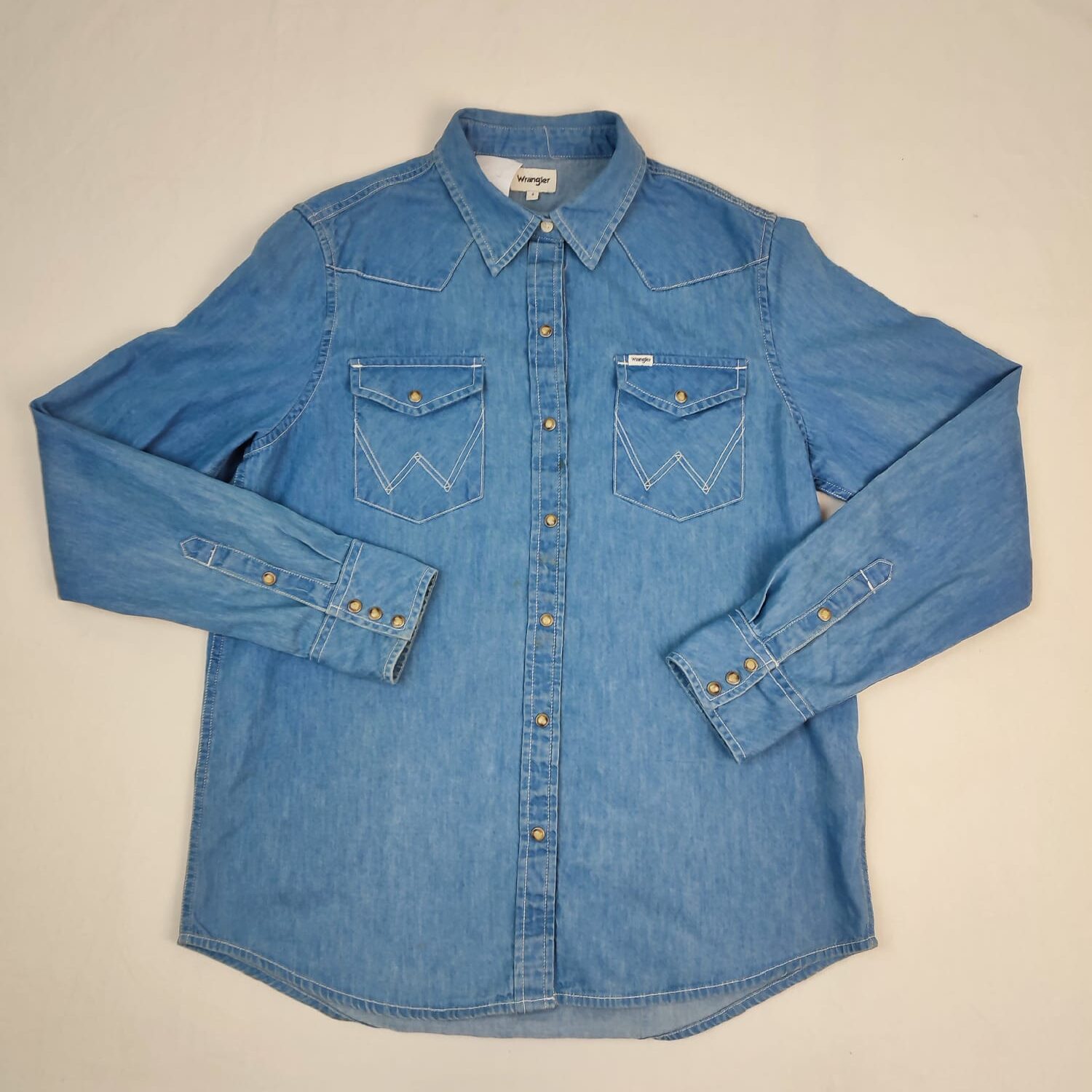 Autres commentaires : Chemise manches longues en denim bleu, col chemise, taille S.