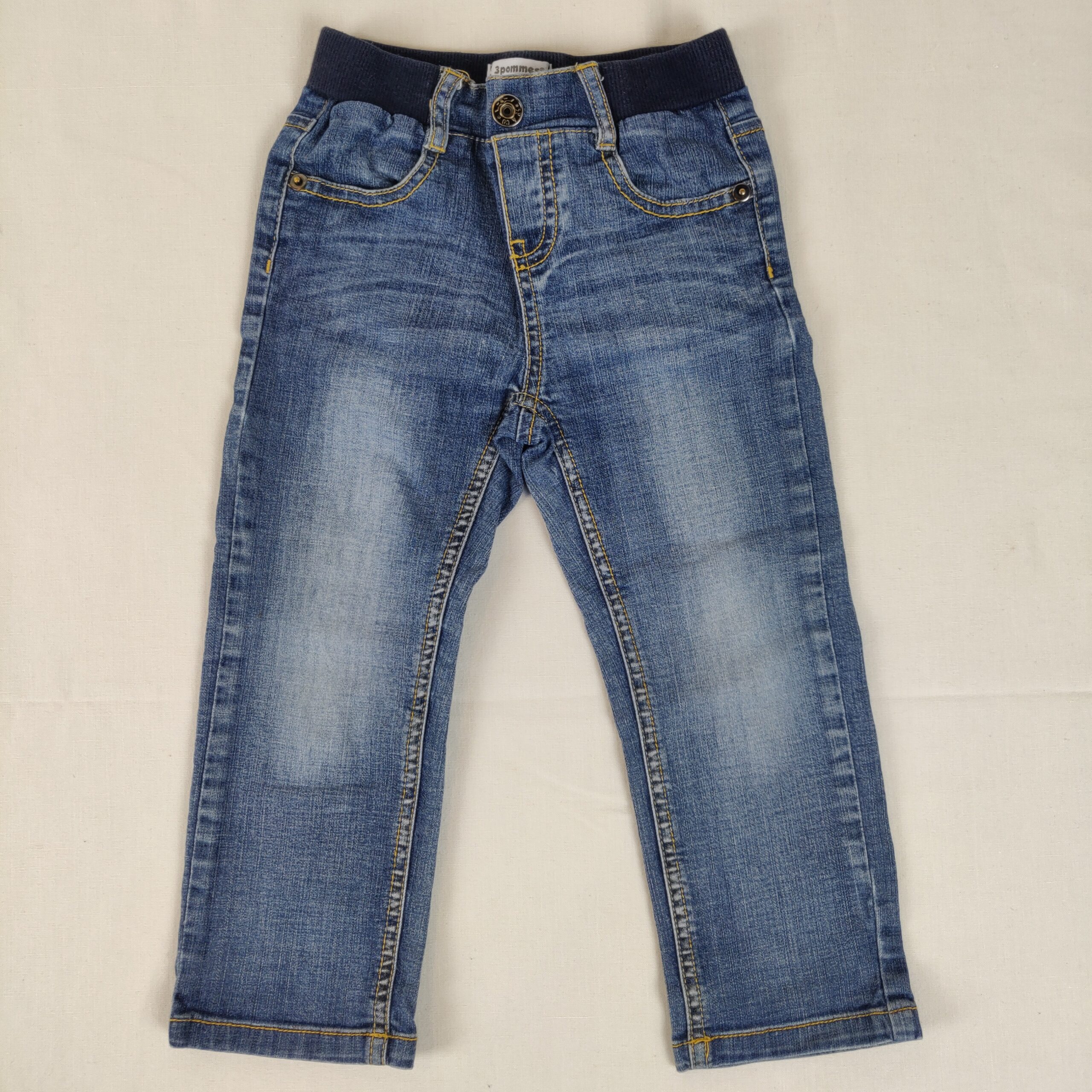 Autres commentaires : Jean – bleu – taille élastique. Ouverture centrale en trompe-l’oeil. 2 poches latérales et 2 poches arrières. Pantalon un peu usé, niveau réduit de Fraise à Myrtille