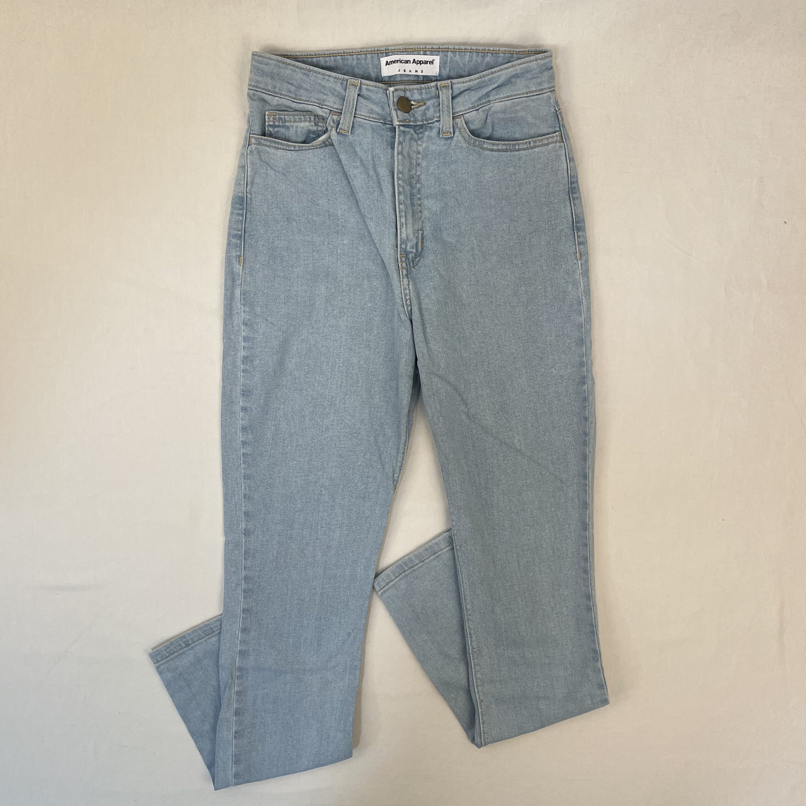 - Jeans bleu délavé, taille haute, fermeture devant par zip et bouton Taille 27 estimée 12/13A.